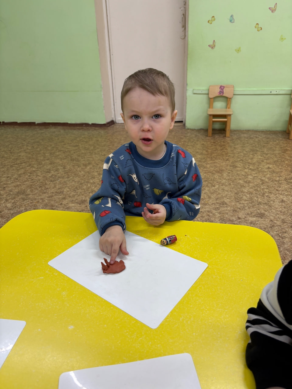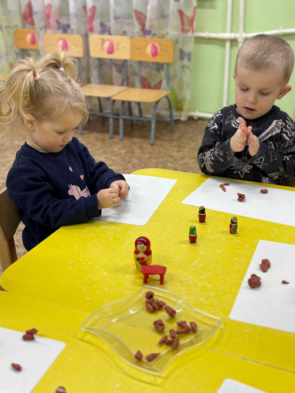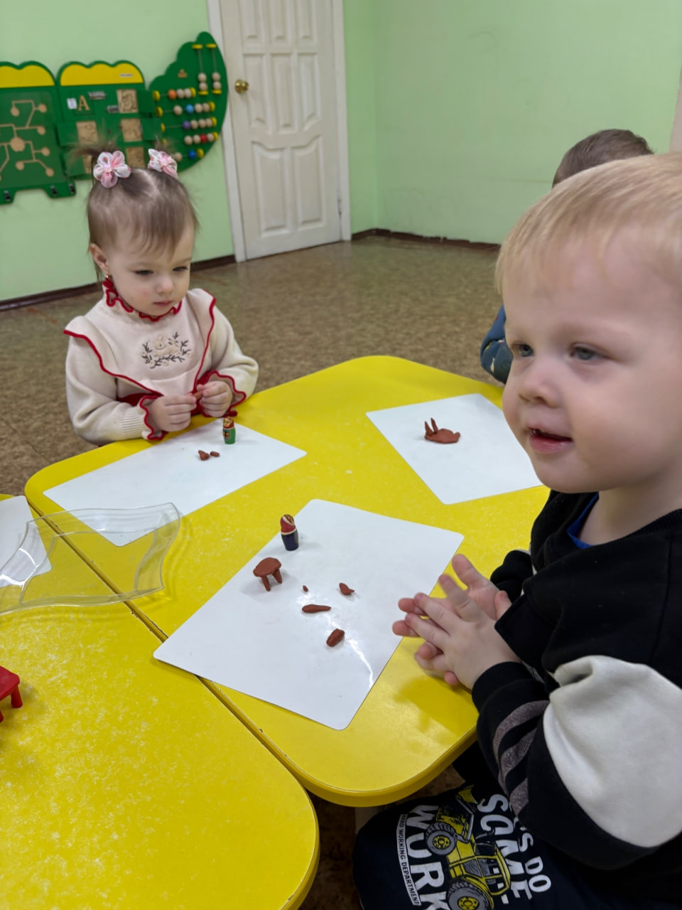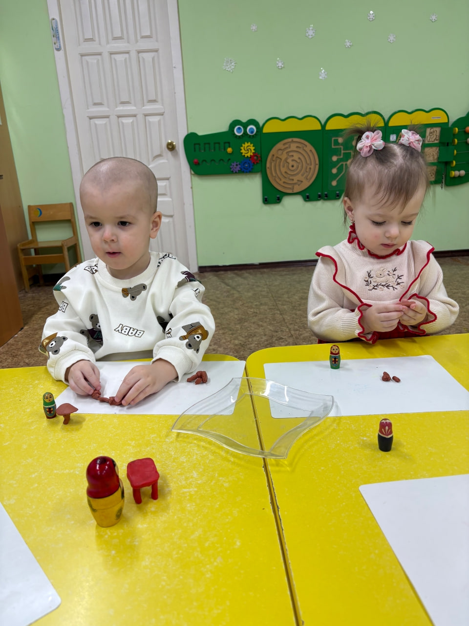А затем началась самая увлекательная часть занятия – лепка из пластилина. Под руководством педагога малыши превратились в настоящих мастеров и принялись создавать «Столик для матрешки».