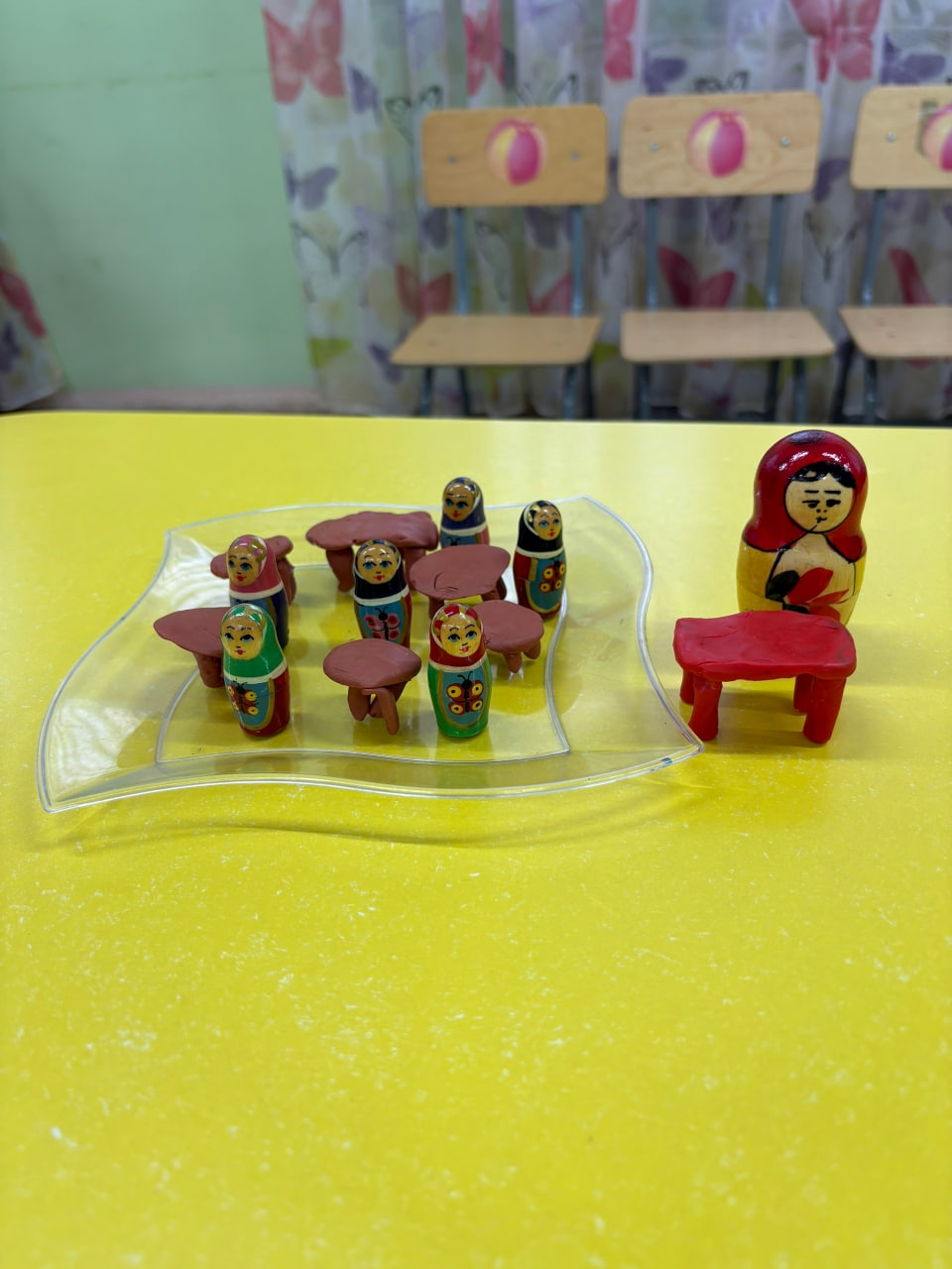 Дети осваивали технику лепки из нескольких частей: аккуратно раскатывали «столешницу», формировали четыре ножки и учились соединять детали. В процессе они запомнили важные термины «столешница» и «ножки» и поняли, как рождается даже самый простой предмет мебели.