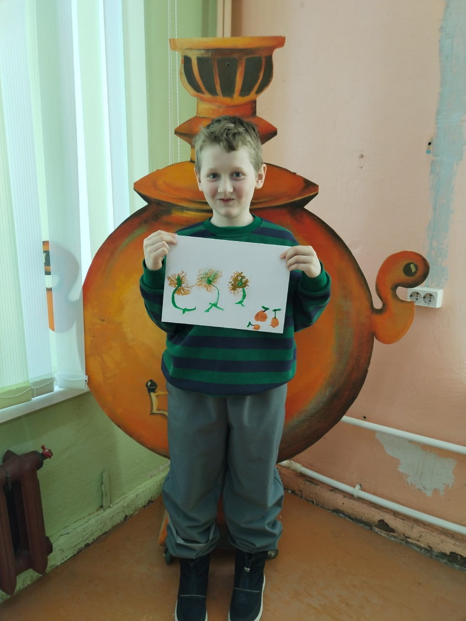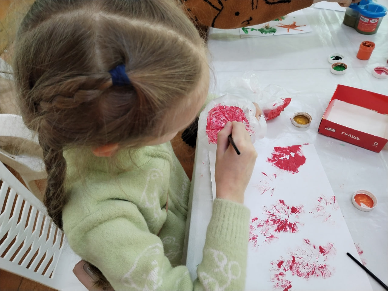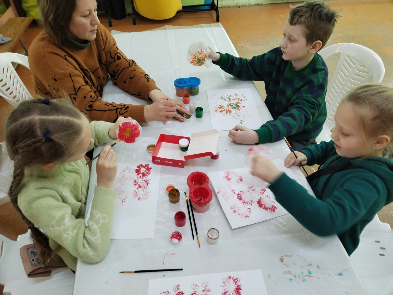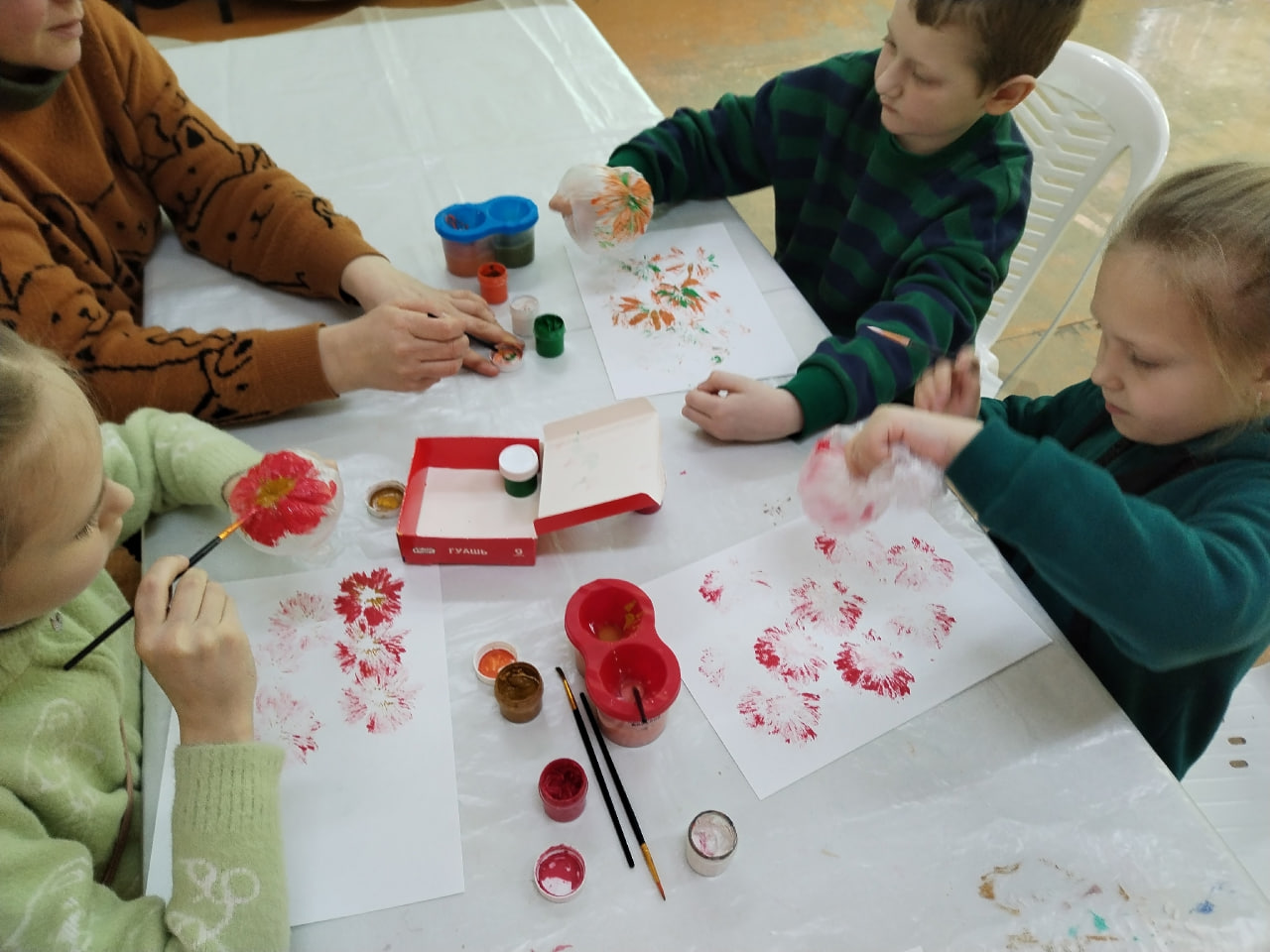 Здесь участники использовали необычный инструмент – целлофановые пакеты. Надув их, как воздушные шарики, ребята аккуратно оставляли отпечатки в краске, создавая оригинальные цветочные композиции.