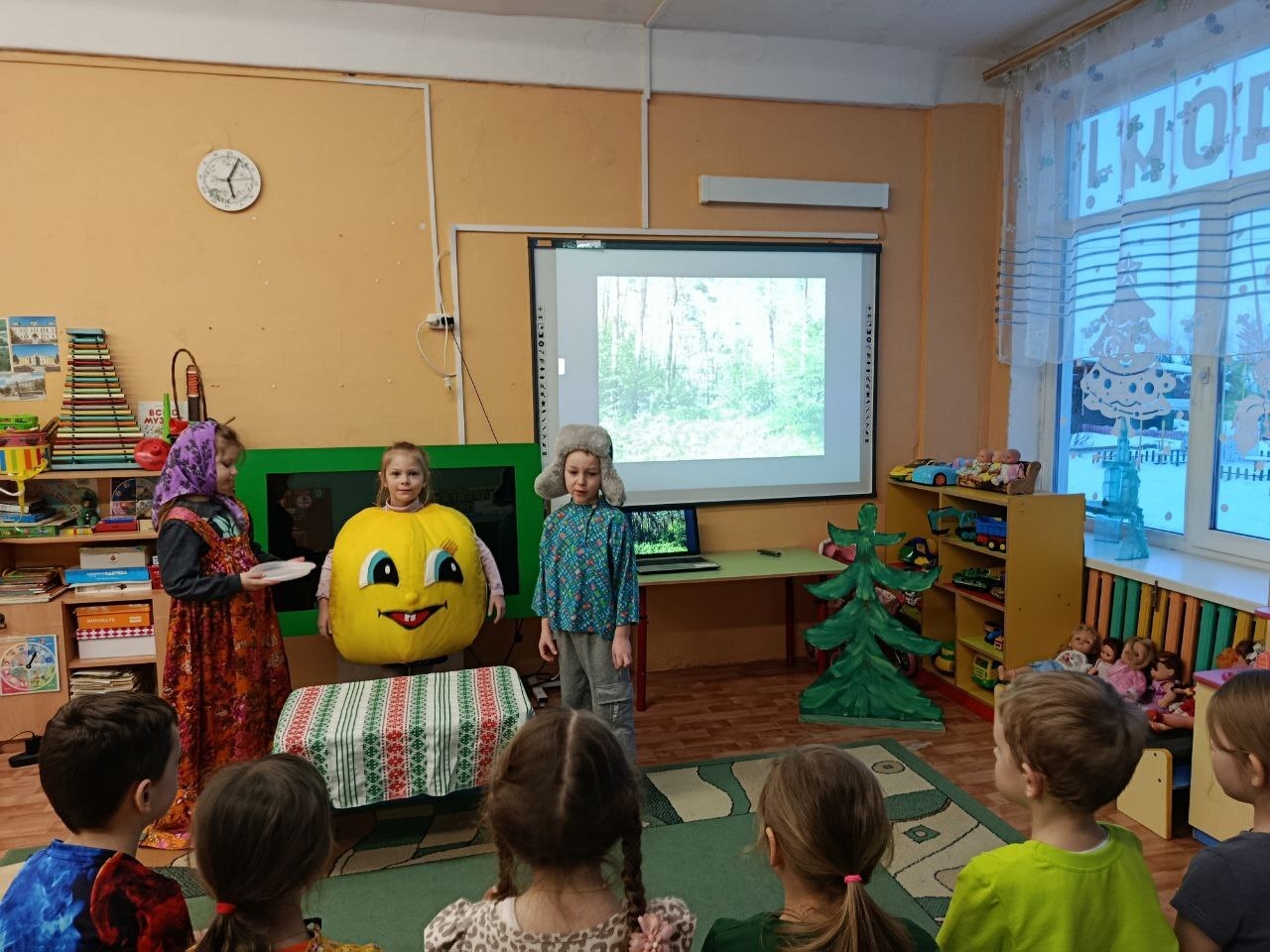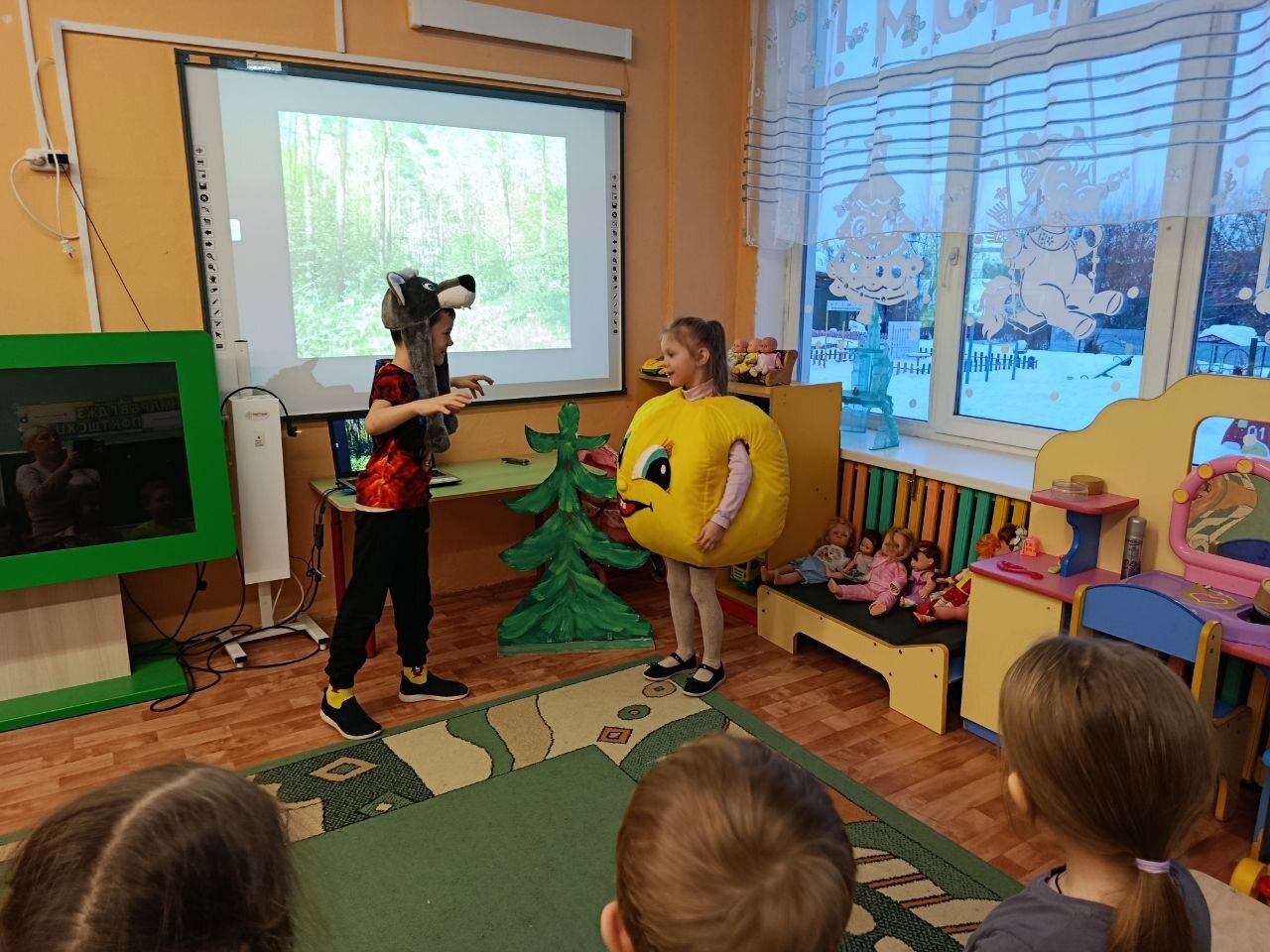 Не обошлось и без любимых сказок! Дети вспомнили множество произведений, где главными героями выступают животные, а главным событием недели стала мини-постановка русской народной сказки «Колобок». Юные артисты перевоплотились в знакомых персонажей и представили спектакль перед сверстниками.