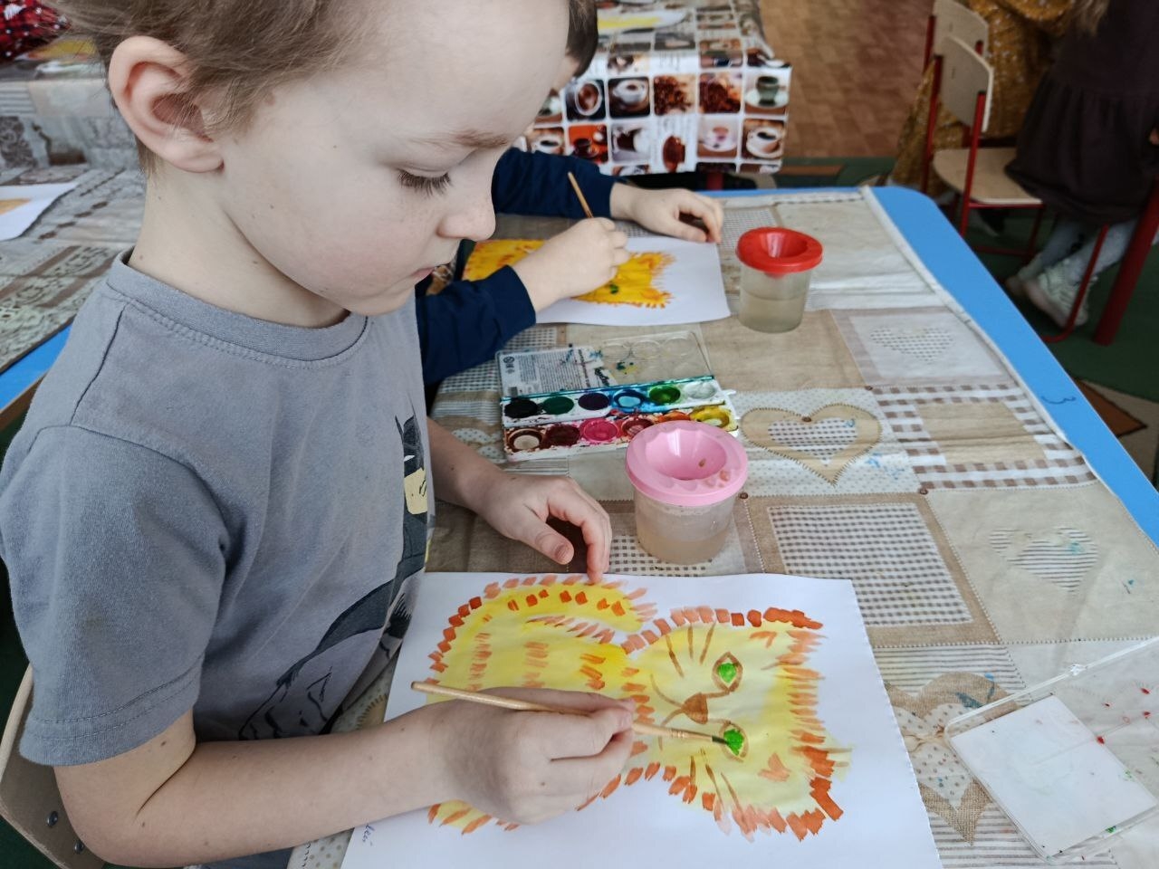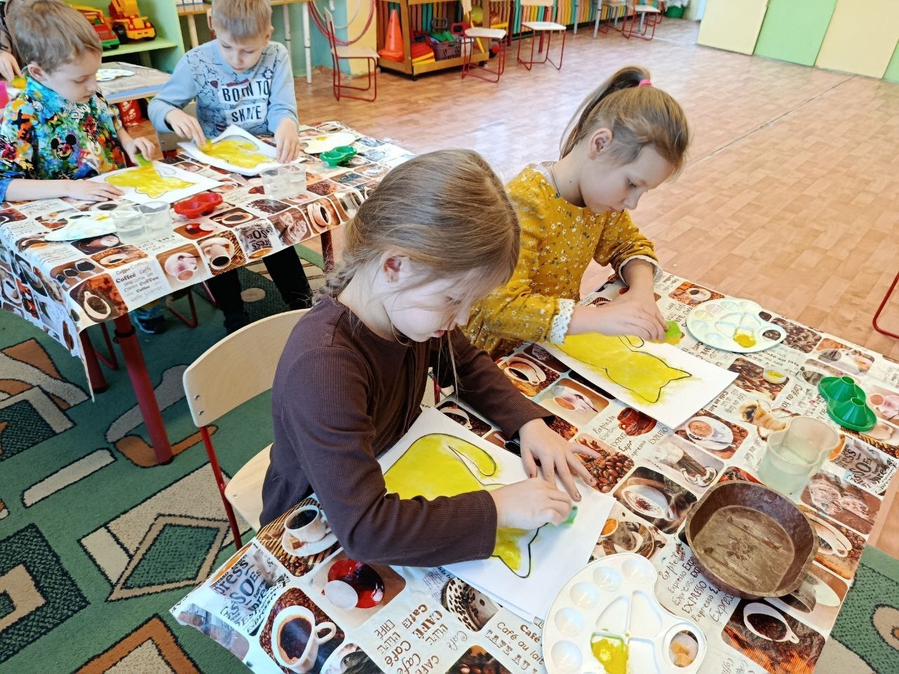 Завершилась неделя творческим занятием по художественной деятельности: дети создавали рисунки котят, используя нетрадиционную технику – кисть для клея и губку.