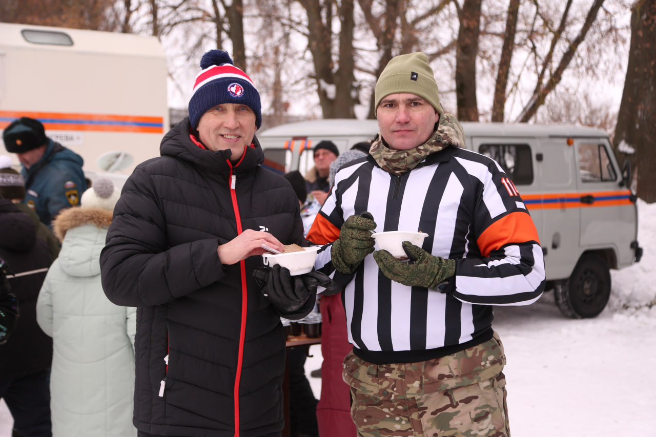 Три возрастные категории, больше двух десятков команд, яркие эмоции и азартная борьба на льду! Зрители болели от души, согреваясь горячим чаем с тульскими пряниками у полевой кухни.
