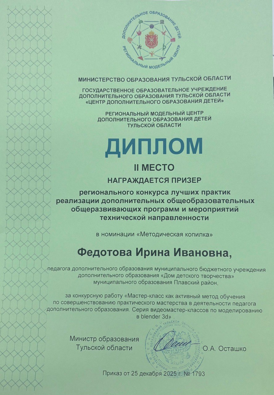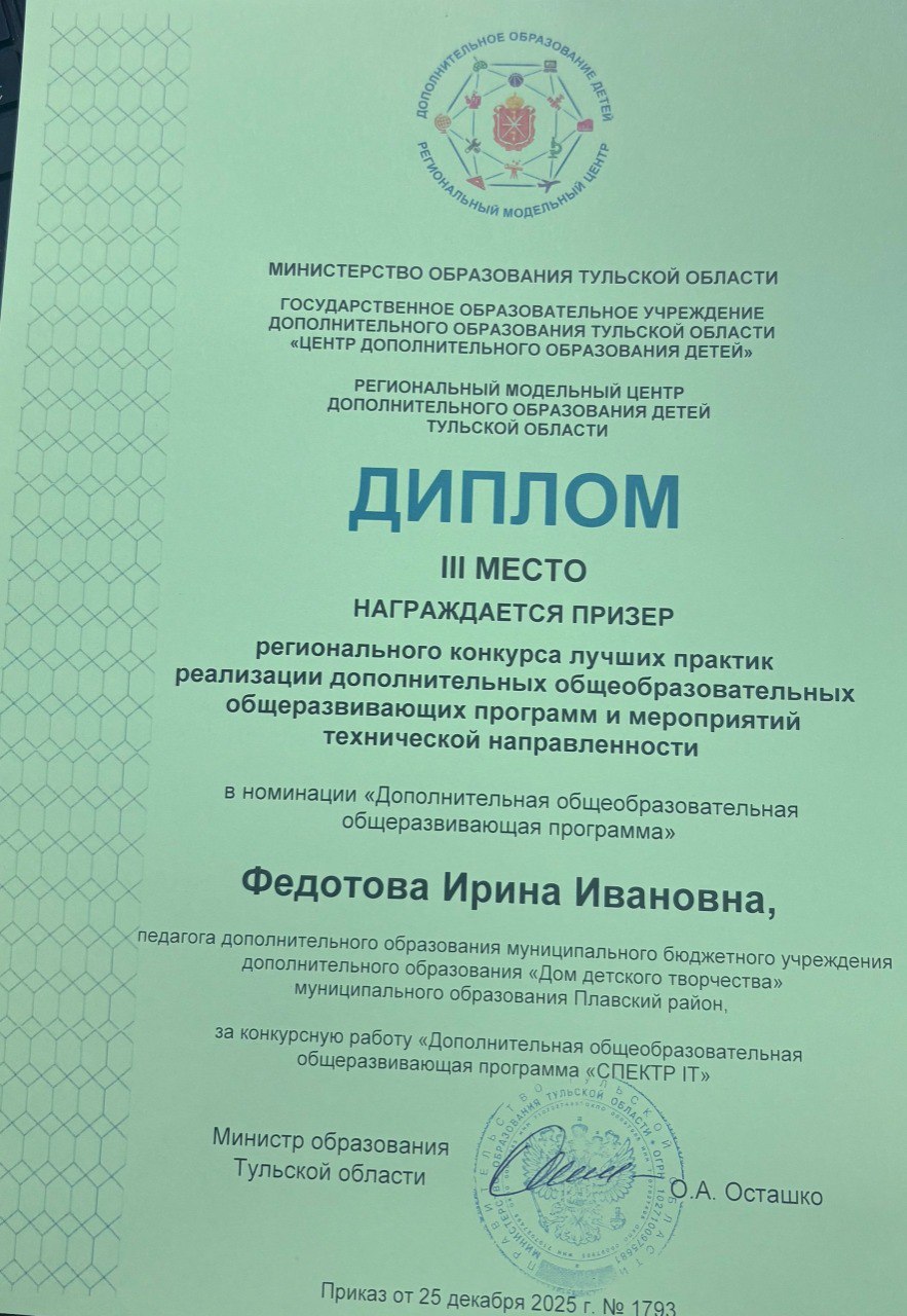 «Победа в конкурсе даёт возможность распространить успешный опыт: методические разработки Ирины Ивановны будут рекомендованы для использования в других образовательных учреждениях Тульской области», – отметила директор ДДТ Екатерина Умнова.