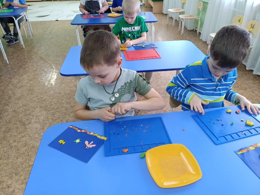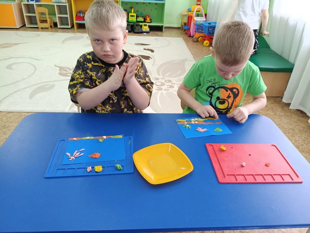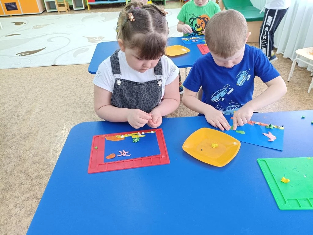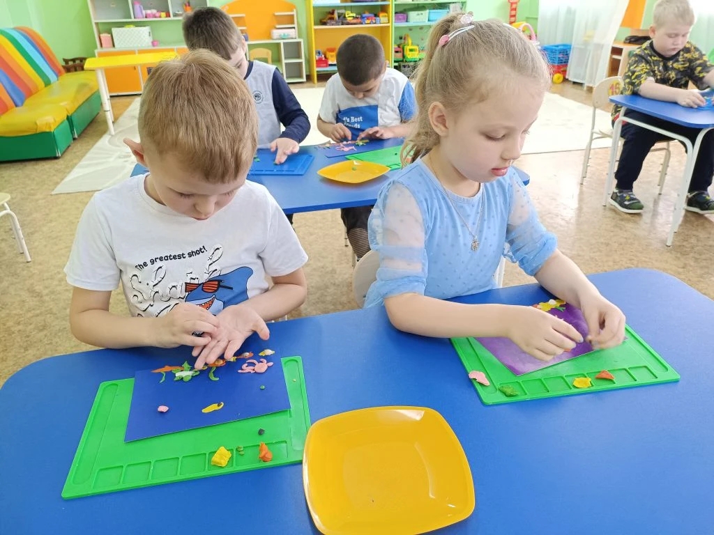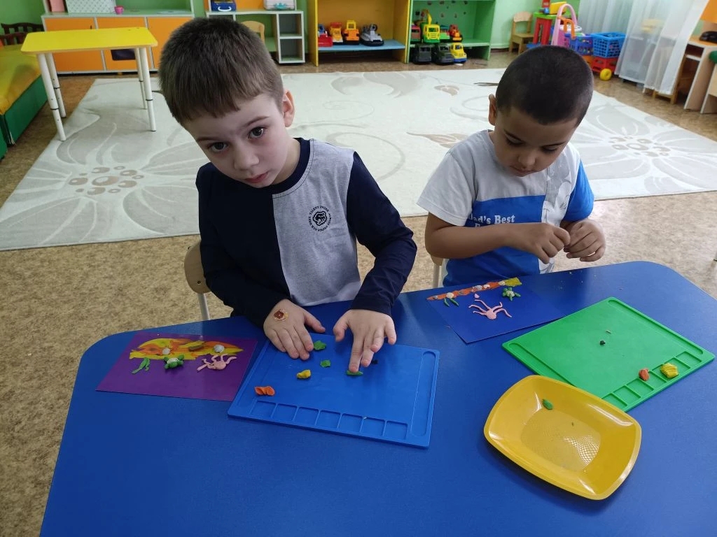 Завершилось занятие творческой лепкой: юные мастера создали яркие композиции с морскими обитателями.