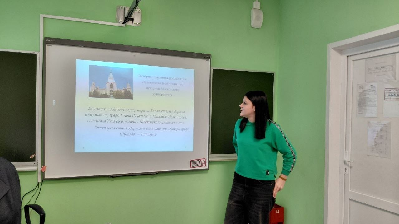 В 8 «В» классе Плавской школы № 2 прошёл тематический классный час, приуроченный к Дню российского студенчества и Дню святой Татьяны, который подготовила и провела ученица Татьяна Максимова.