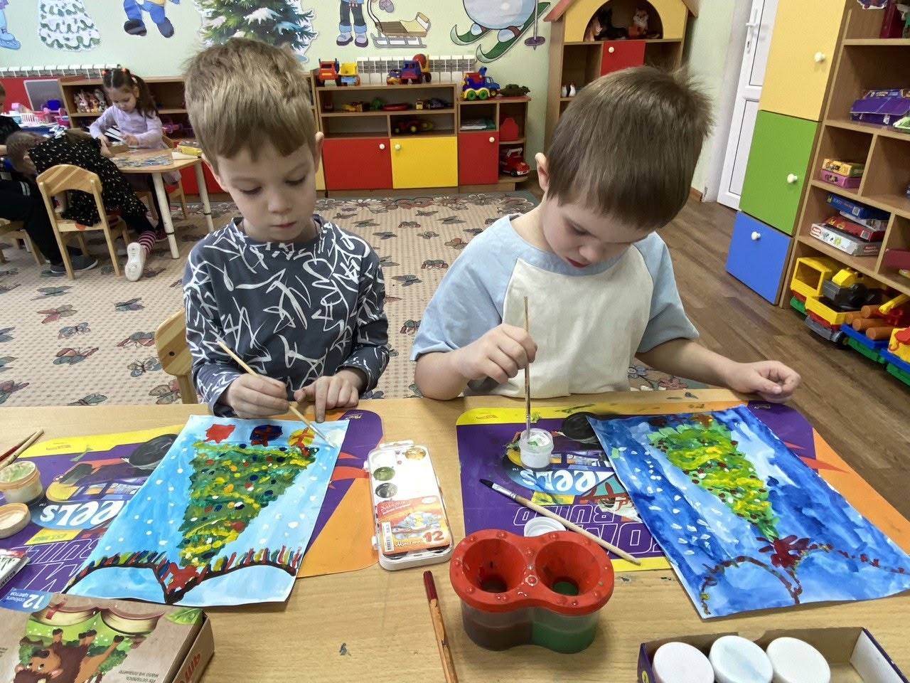 Воспитанники детского сада «Улыбка» поселка Горбачево на время вообразили себя живописцами и увлеченно работали над рисунком украшенной к празднику новогодней красавицы.