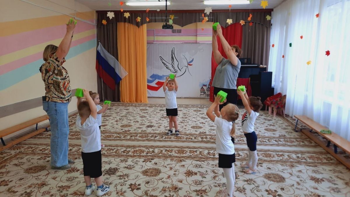 Воспитанники 1-й младшей группы детского сада комбинированного вида №1 занимаются физкультурой под руководством педагогов.