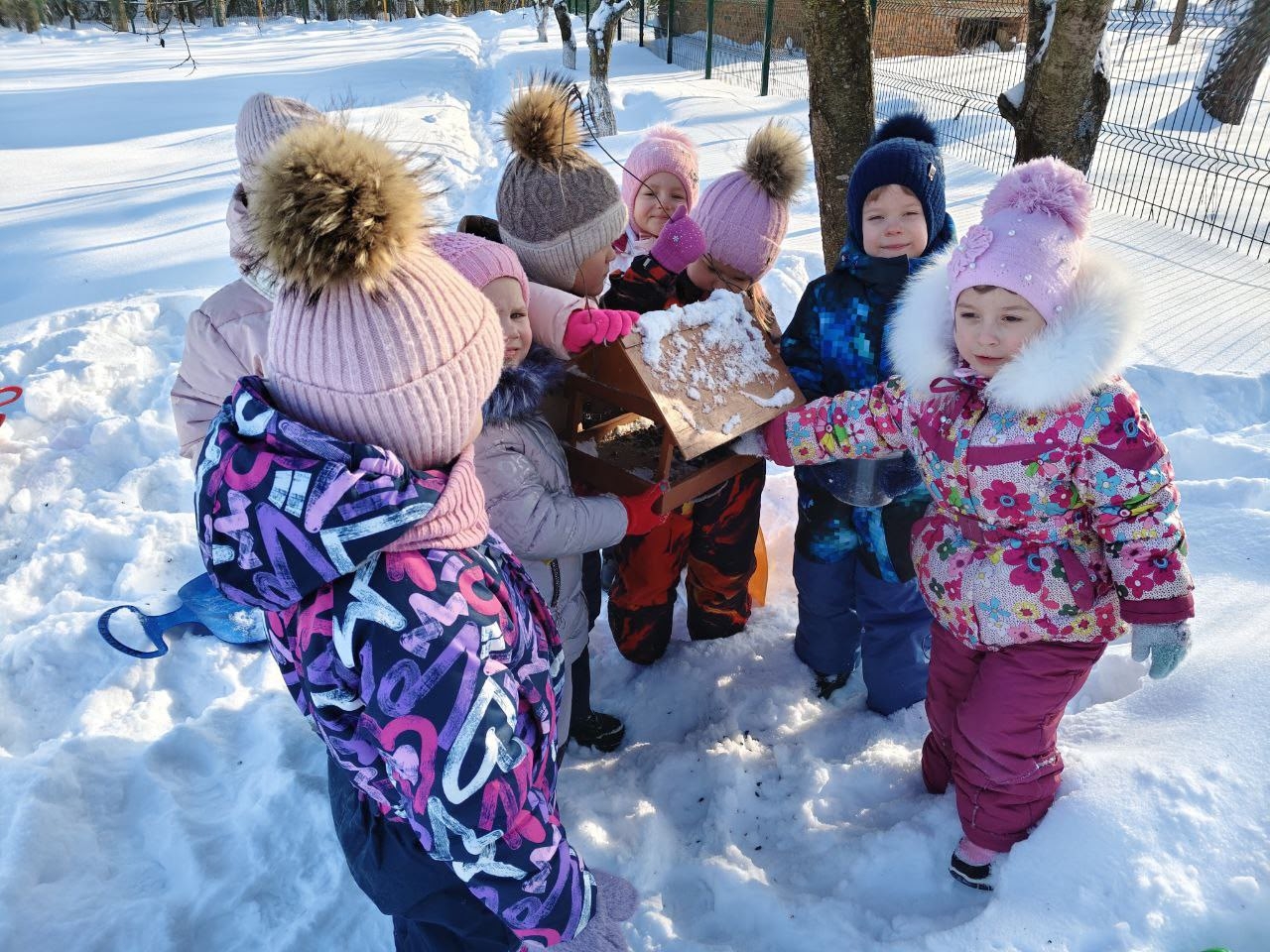 Дети старшей группы детского сада «Улыбка» соорудили вместе с родителями кормушки и принесли из дома зернышки и семечки.