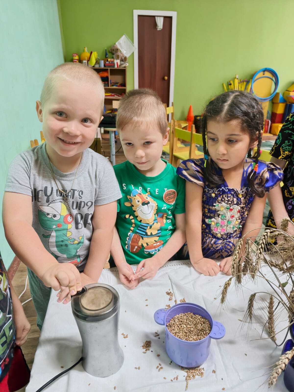 Накануне праздника для них провели увлекательное мероприятие. Дети узнали, как зерно превращается в хлеб: от пшеничного поля до ароматной буханки на столе. Они даже попробовали себя в роли настоящих мельников — сами перемалывали пшеничные зёрна в муку!