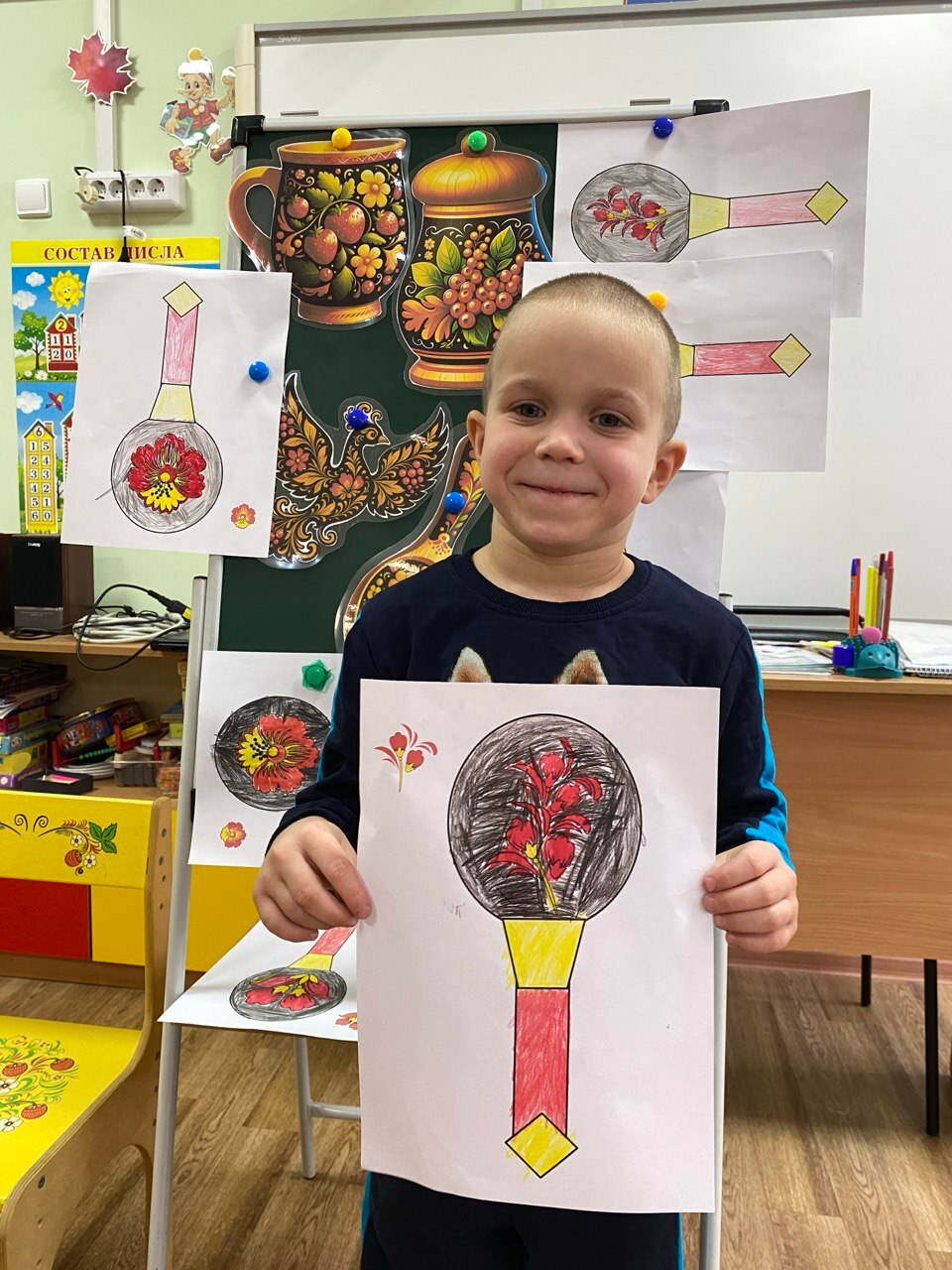 А затем каждый смог попробовать себя в роли настоящего хохломского мастера: дети расписывали бумажные ложки в традиционном стиле — с красными ягодами, зелёными листьями и чёрными завитками.