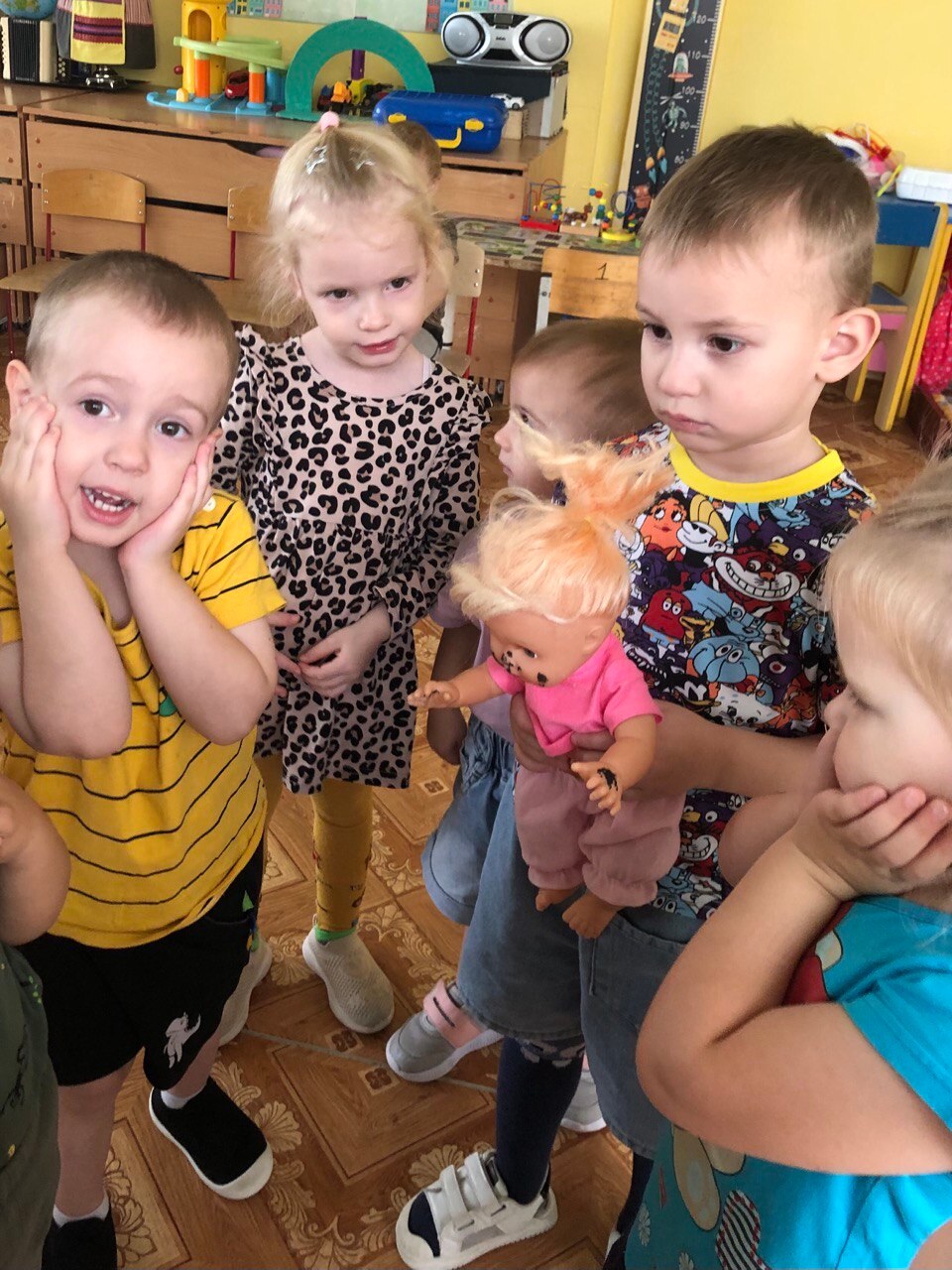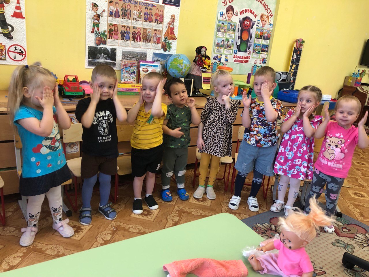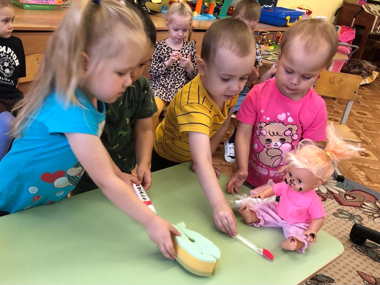 В ходе игры дошколята рассказали и показали предметы личной гигиены — мыло, полотенце, расчёску, зубную щётку — и объяснили, зачем они нужны. А затем с помощью пальчиковой игры «Водичка, водичка» «умыли» куклу, сделали её опрятной и помогли ей найти друзей.