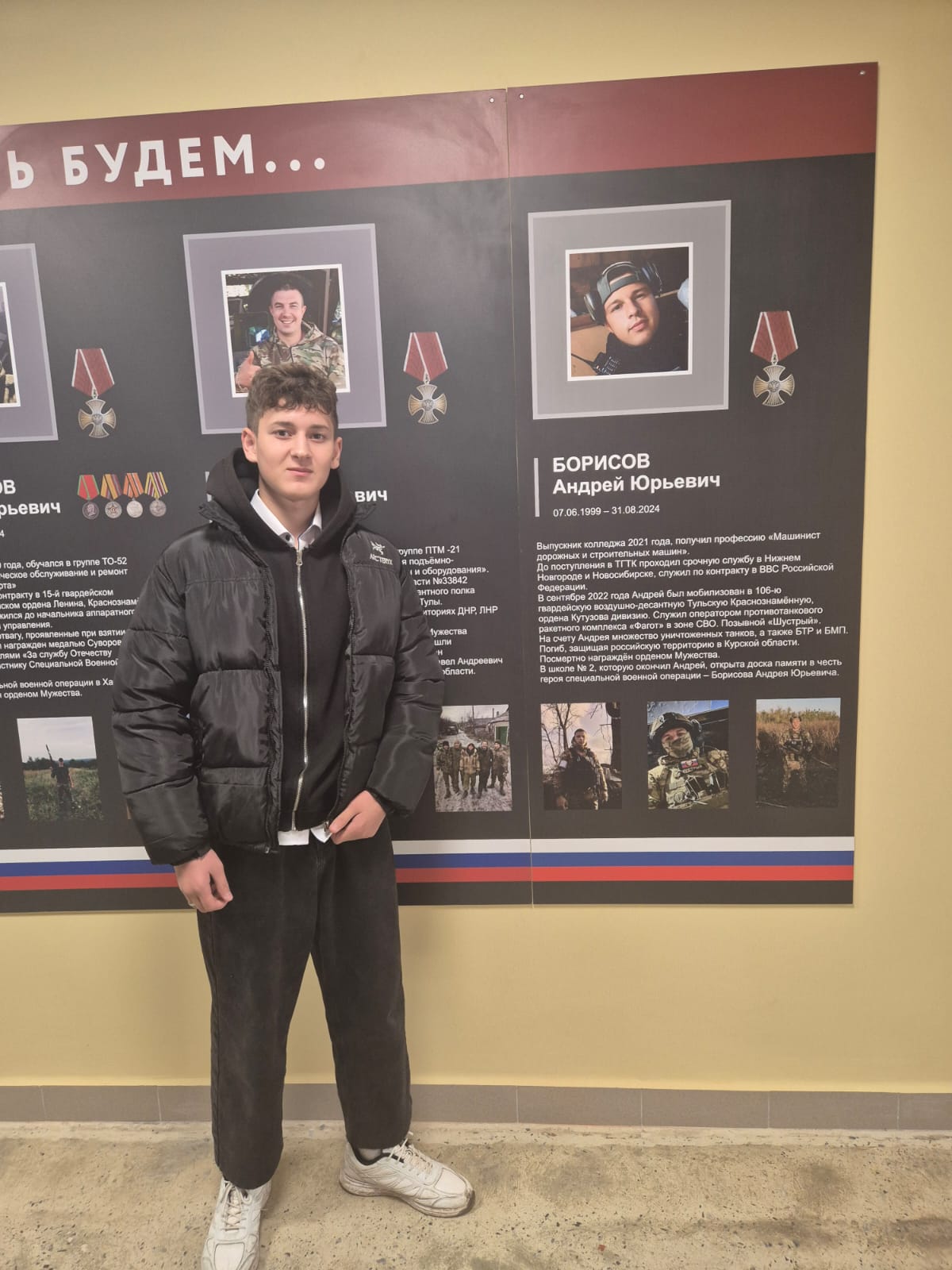Среди увековеченных имён — и наш земляк, Андрей Борисов из Плавска. За мужество и героизм он был посмертно награждён орденом Мужества. Андрей был не просто студентом — он олицетворял трудолюбие, целеустремлённость и верность долгу. От парты колледжа он прошёл путь до фронта, став настоящим защитником Родины. Сегодня его имя навсегда вписано в историю учебного заведения и в сердца земляков.
