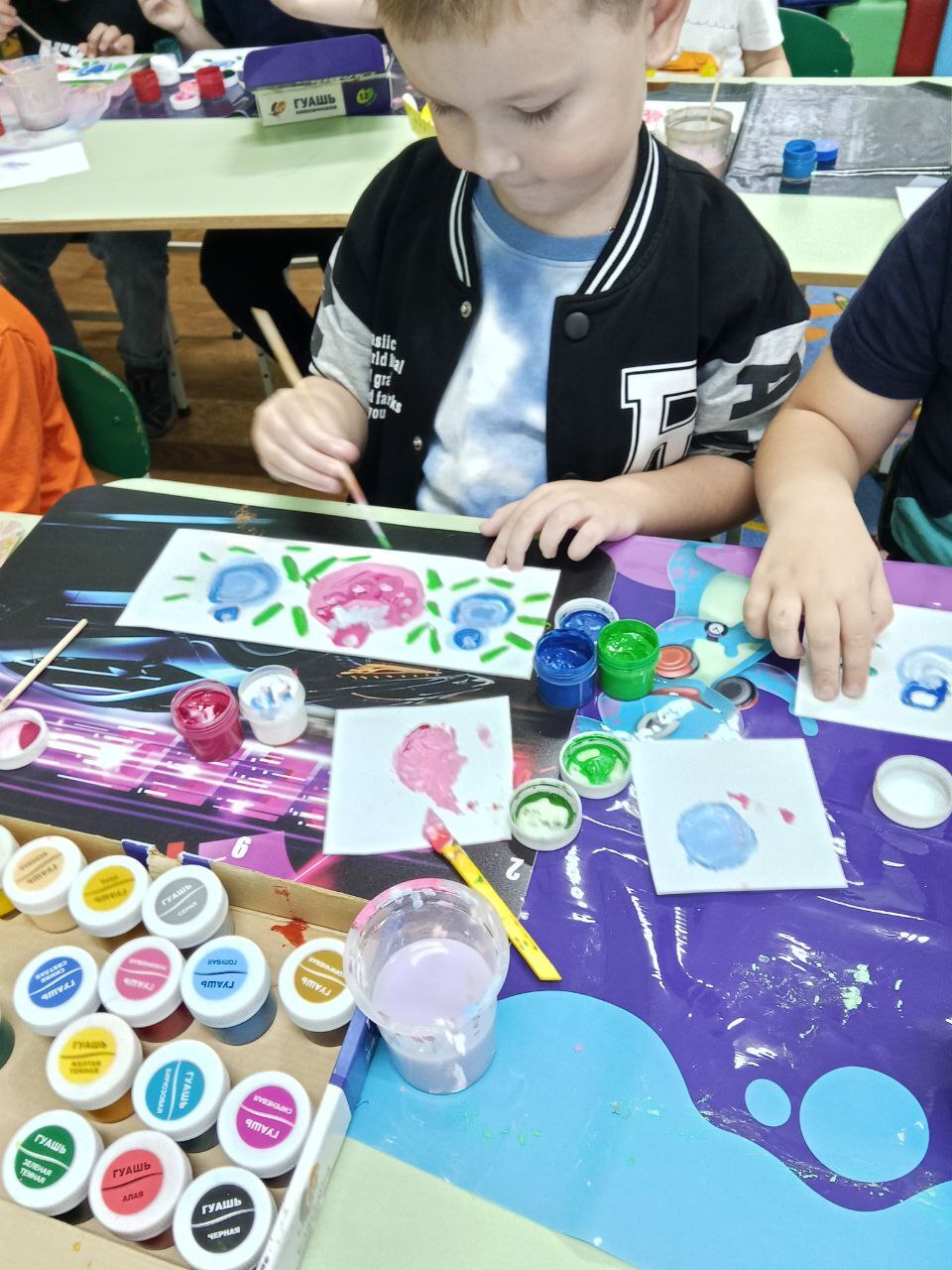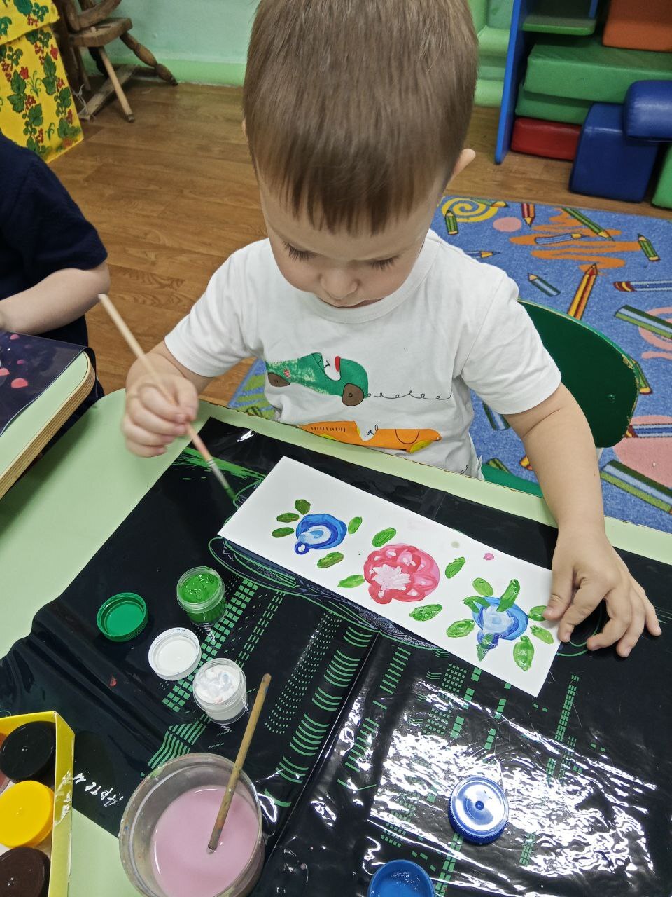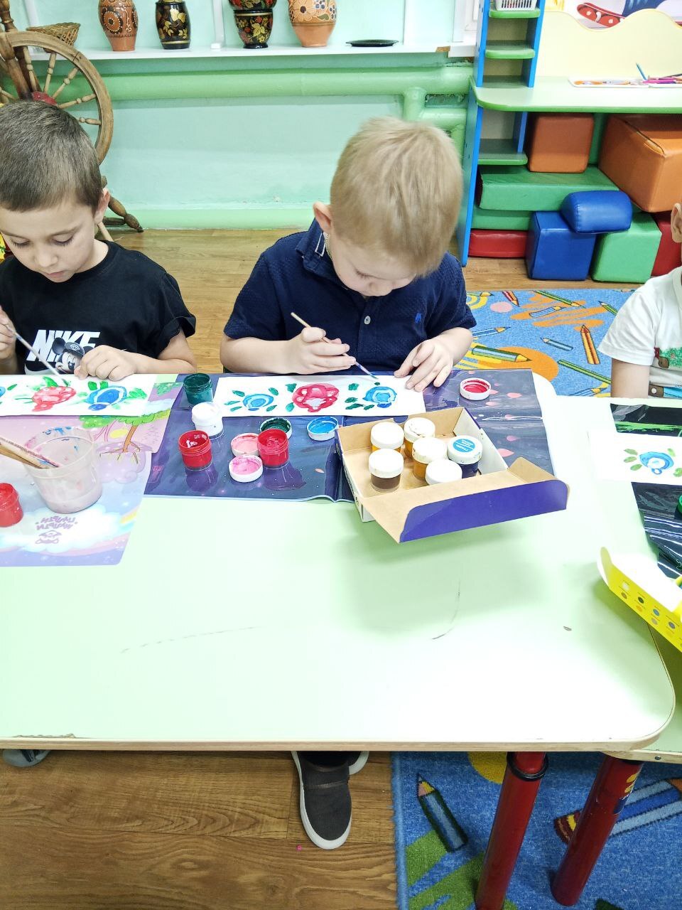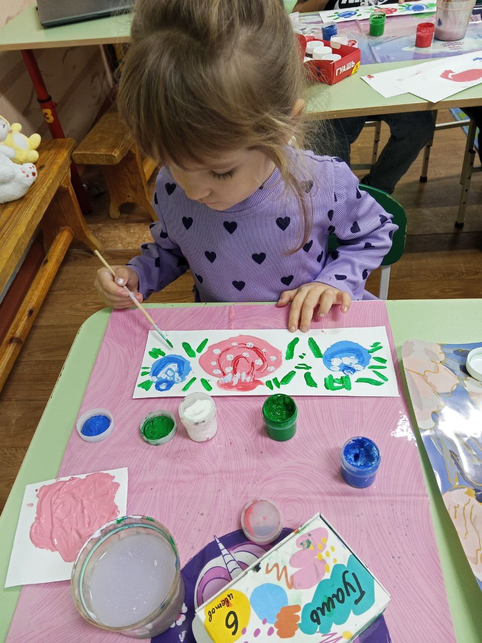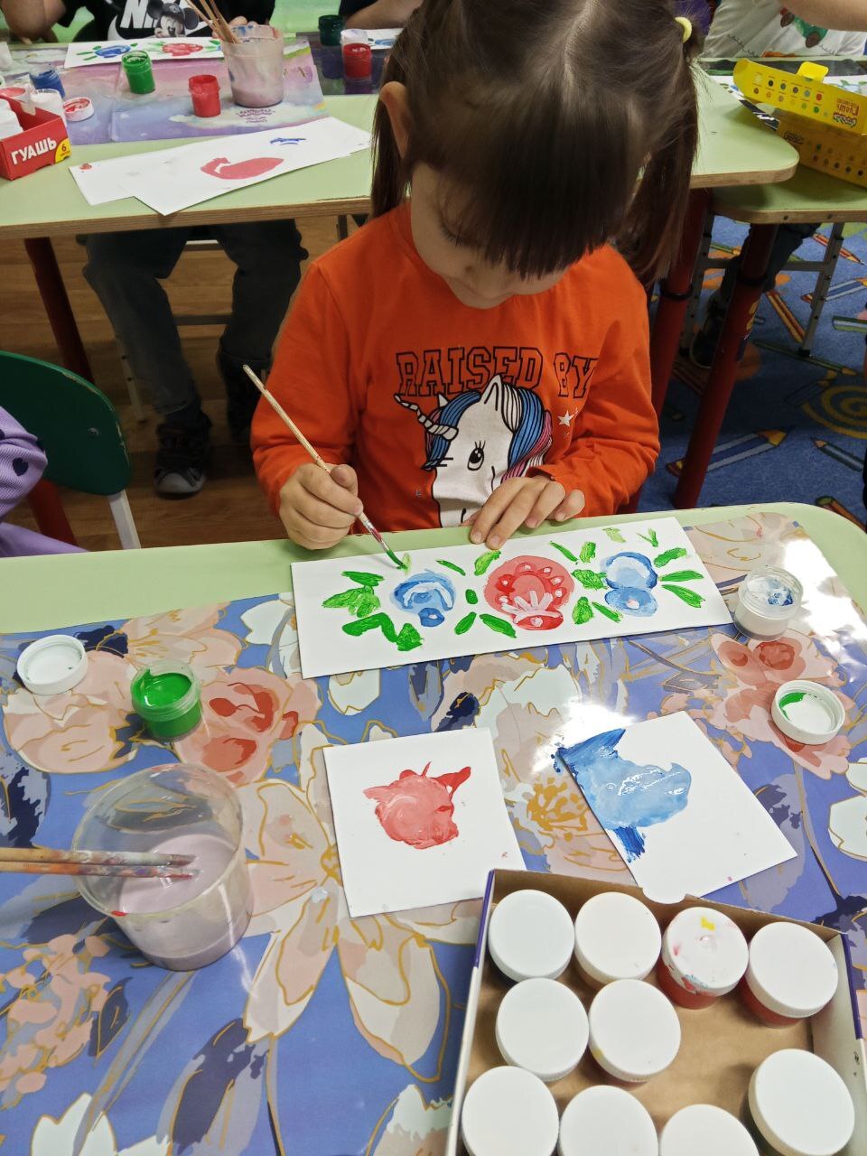 А потом дети попробовали себя в роли мастеров росписи. Они осваивали технику выполнения розанов, листьев, бутонов. Тщательно подбирали краски.