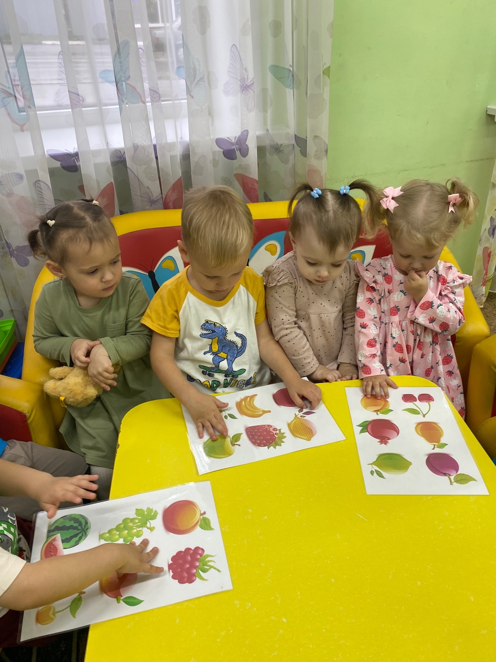 Во время познавательного занятия дети внимательно рассматривали изображения различных фруктов. Ребята учились различать и запоминать их формы, сравнивая размеры и оттенки.