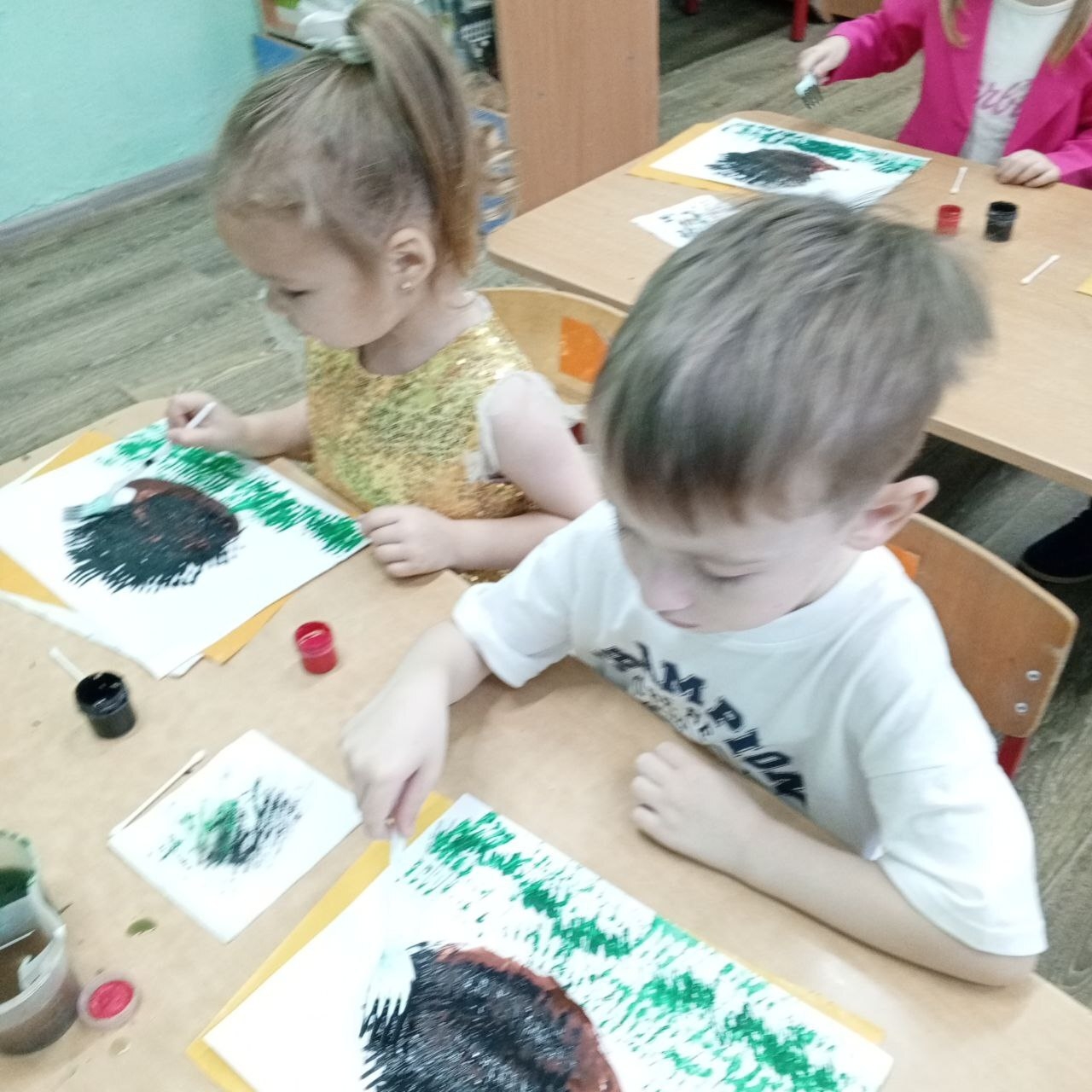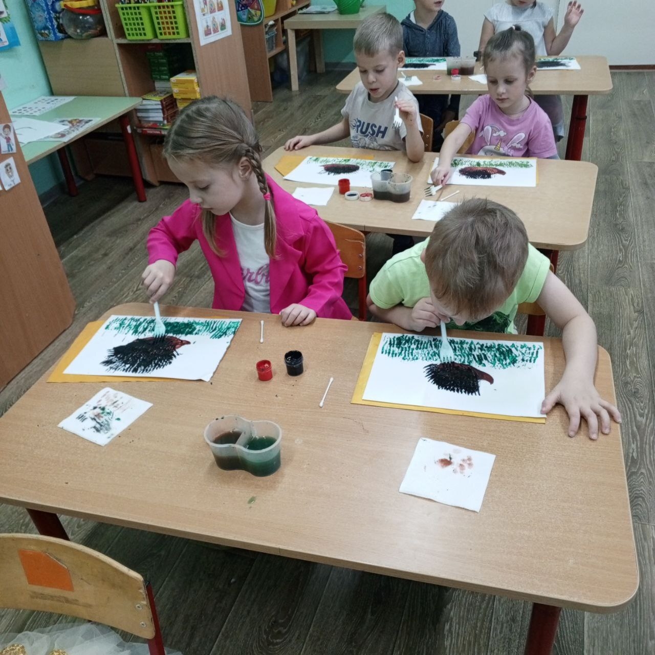 С её помощью малыши нарисовали иголки, в результате на листочках появились весёлые, колючие ёжики.