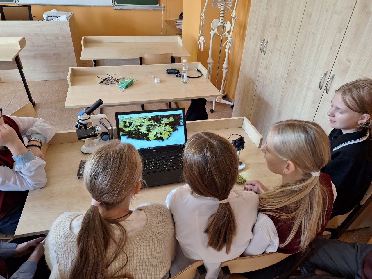Во время этапа «Наблюдение» школьники с помощью электронной лупы изучали строение мха и лишайника, а под микроскопом рассматривали образцы растительных тканей.