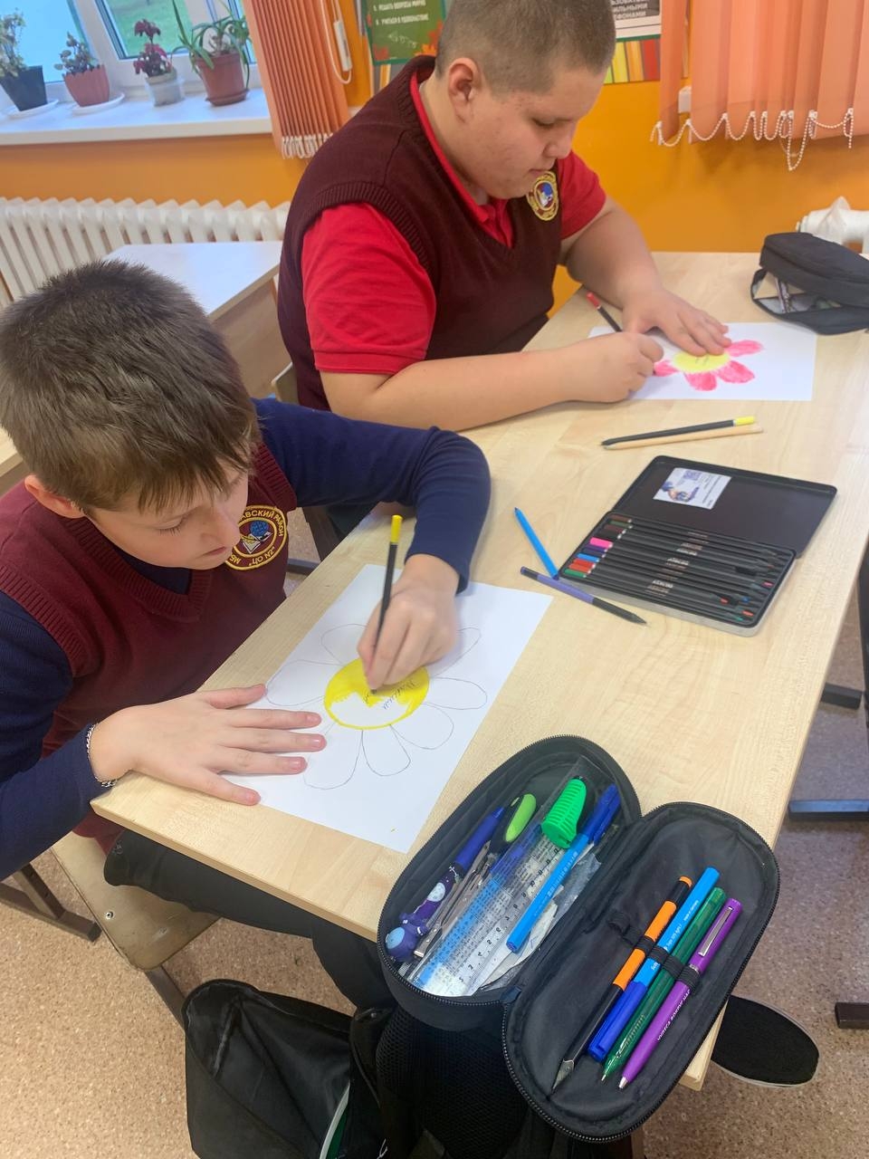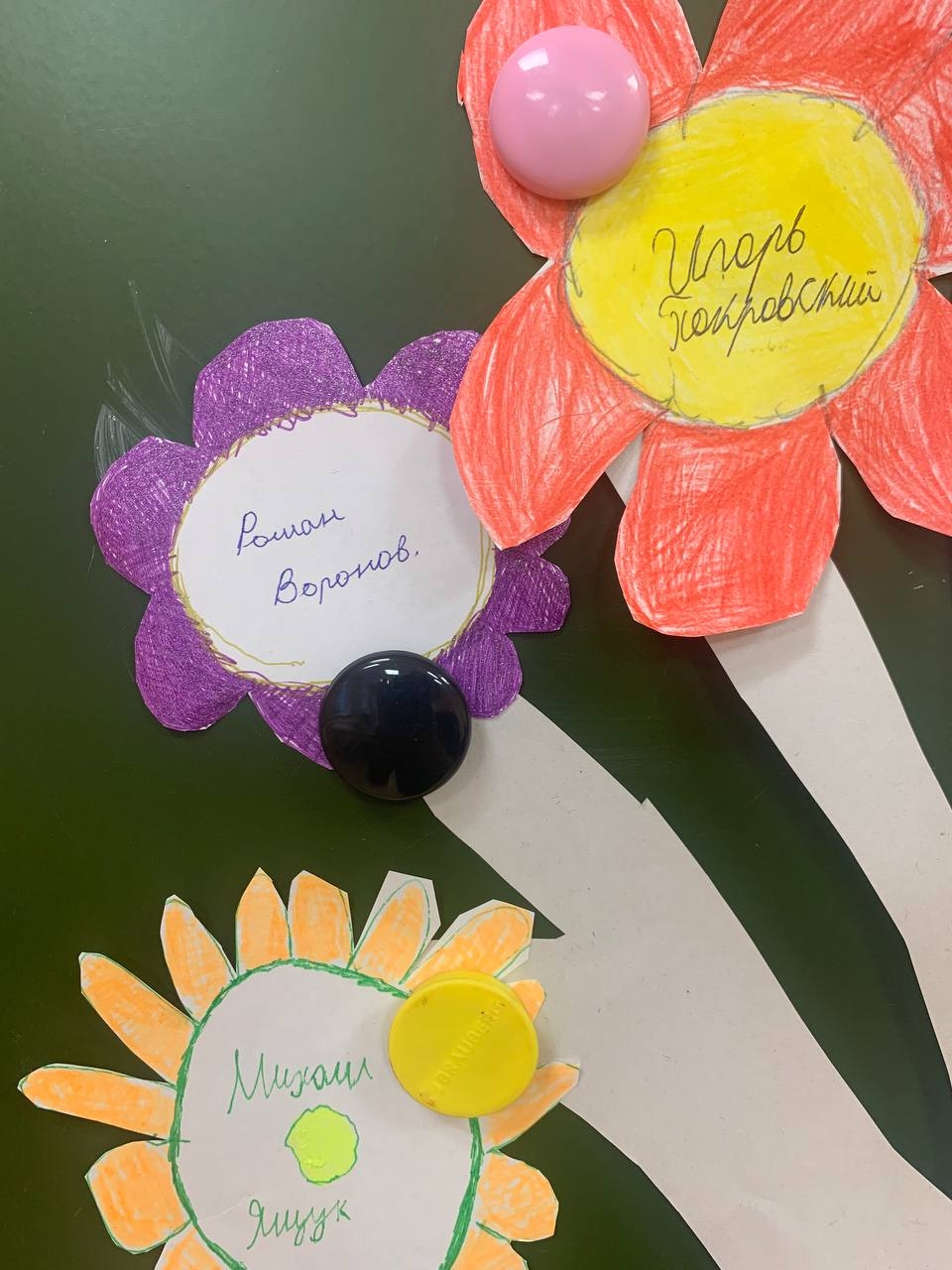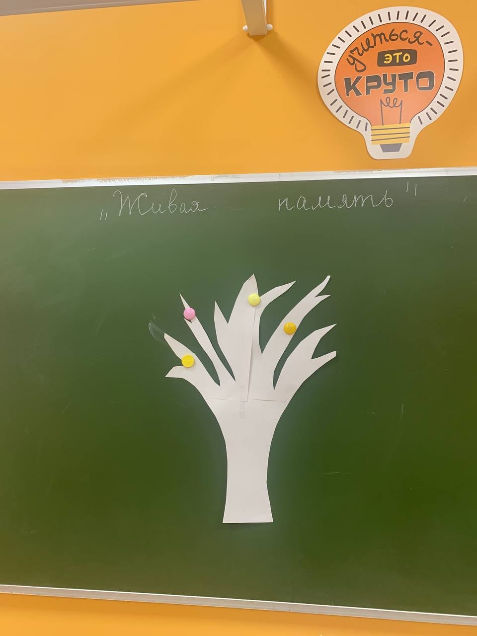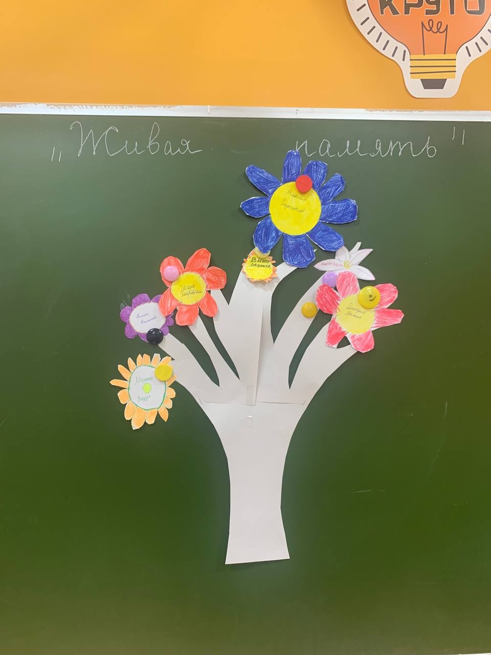 Советник школы Марина Королева и обучающиеся 6 класса приняли участие в мероприятии. На доске была оформлена символическая композиция в виде дерева, к которому ученики прикрепили бумажные цветы. На каждом цветке они написали имена погибших сотрудников органов внутренних дел, создавая общую композицию.