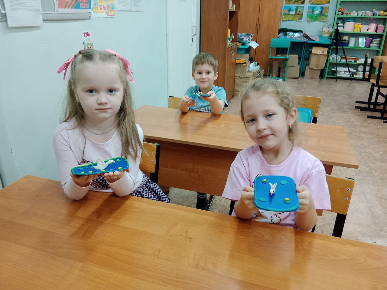 Сначала дети сформировали небольшое озеро на подложке. На «водную гладь» они поместили белоснежных лебедей, которые грациозно плавали среди пластилиновых кувшинок.