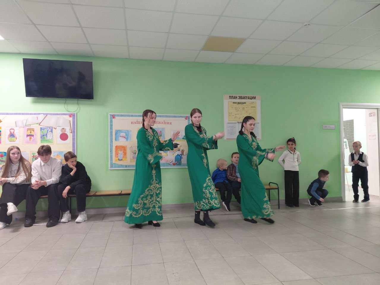 На переменах коридоры оживали: на экранах — яркие хохломские расписные ложки, красочные костюмы осетин, башкирские ковры, чеченские песни. Ребята рассказывали, как готовят блюда — от башкирского «чак-чака» до карельских пирогов. Сказки, пословицы, звуки народных инструментов — всё это звучало не как задание, а как открытие. Дети смотрели, слушали, удивлялись — и впервые поняли: Россия — это не только карта, а тысячи живых историй.