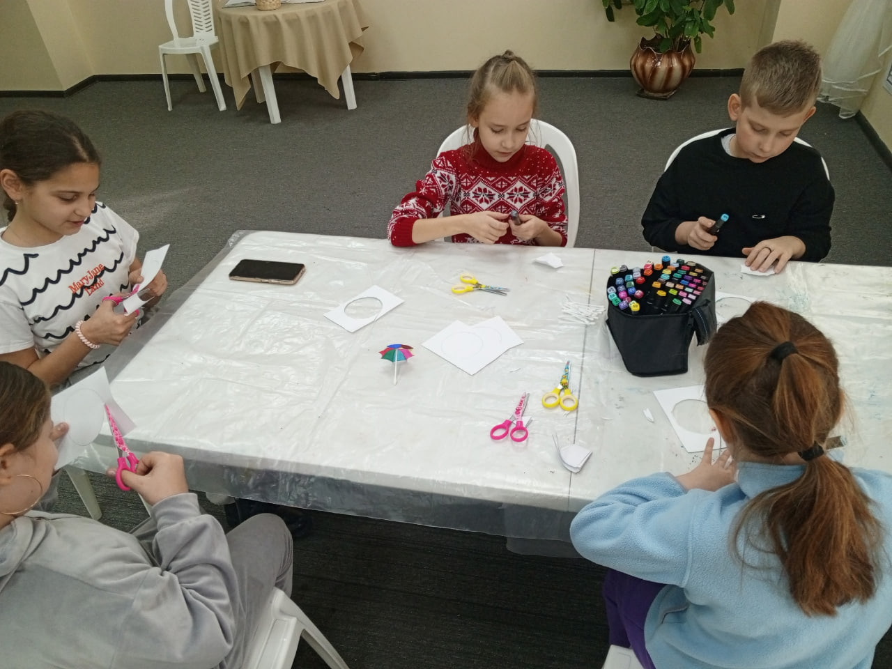 На мастер-классе участники мастерили маленькие бумажные зонтики, раскрашивая их разноцветными красками.