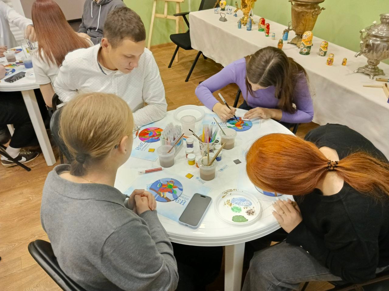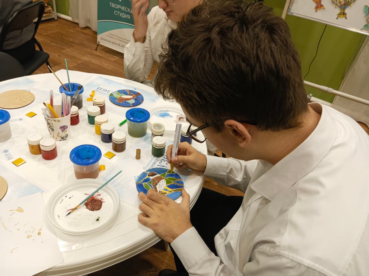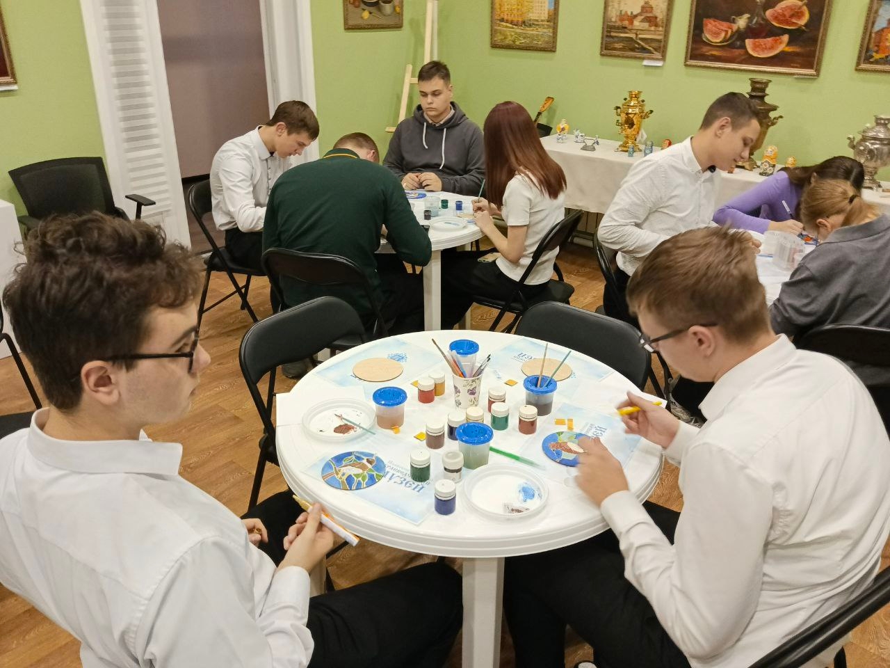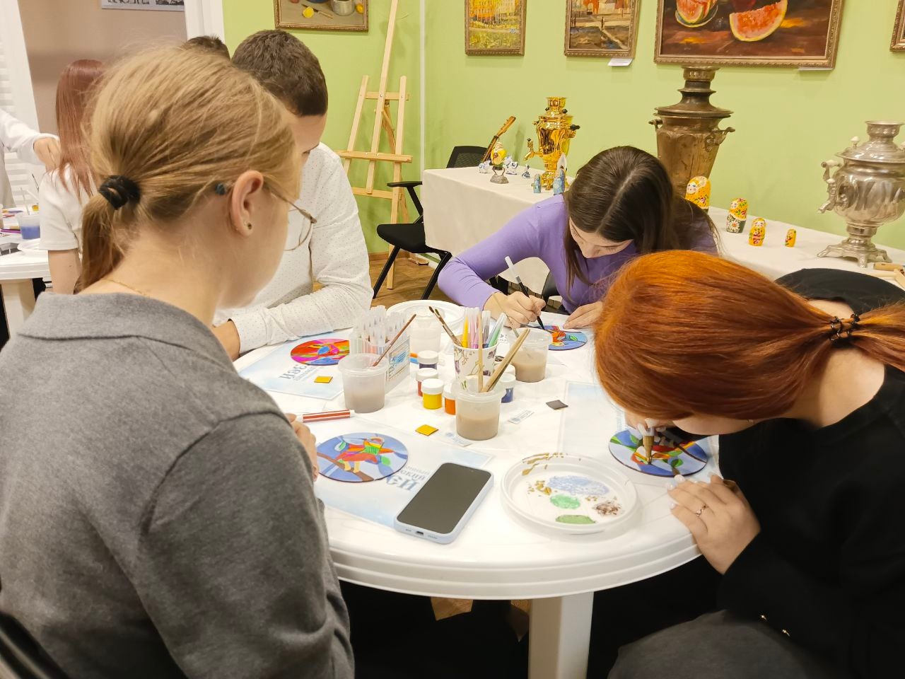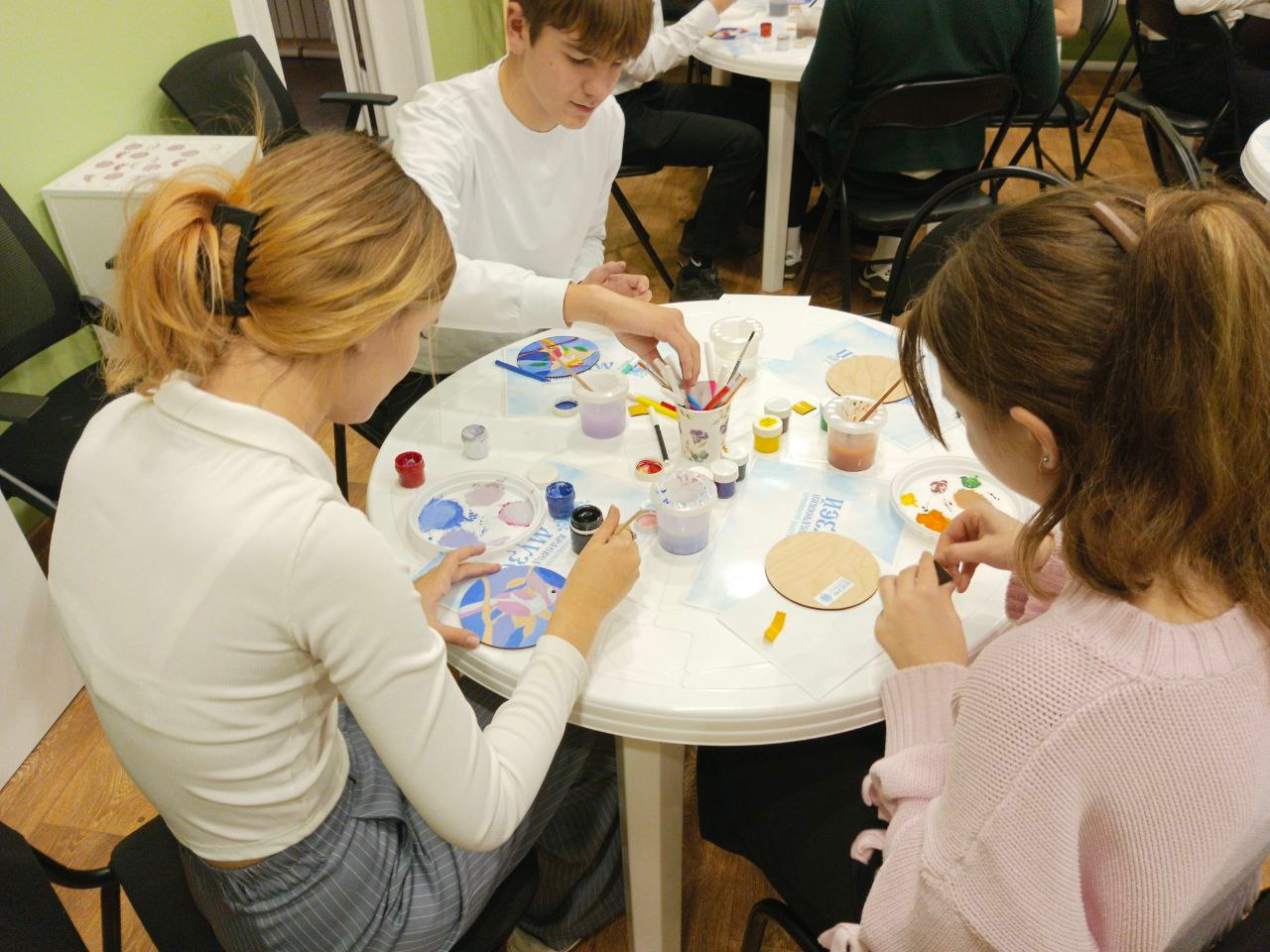 В стенах культурного центра ребят встретила Ирина Бреднева, которая провела для них мастер-класс по росписи деревянных магнитов в витражной технике.