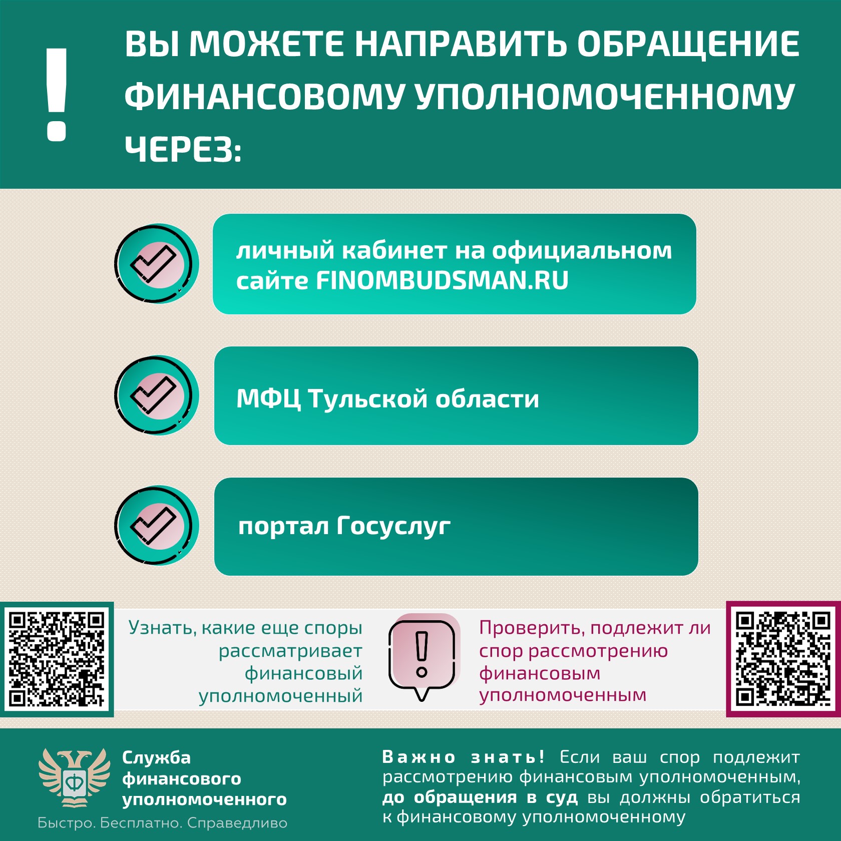 Направить обращение финансовому уполномоченному можно через личный кабинет на сайте finombudsman.ru или через МФЦ Тульской области.