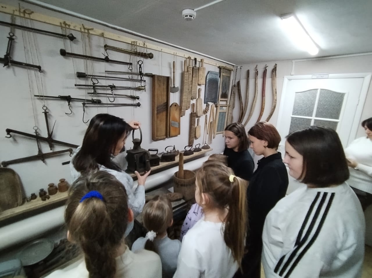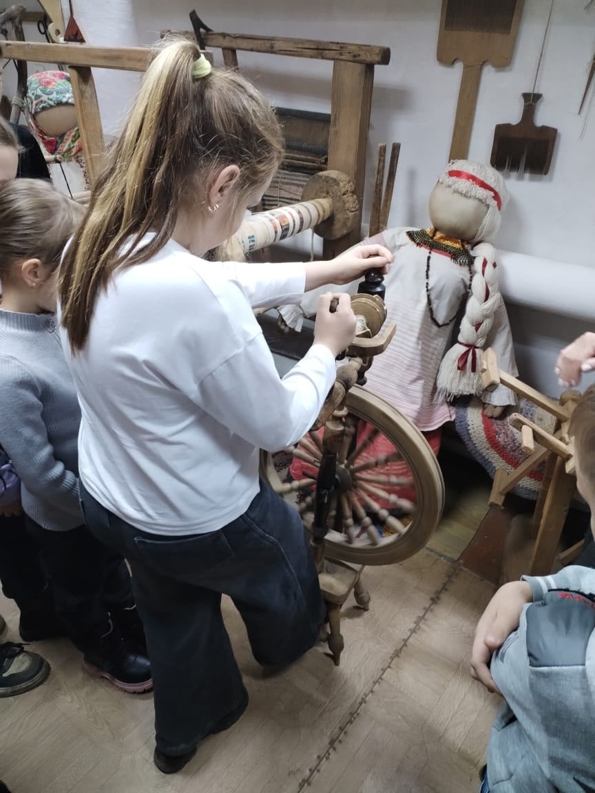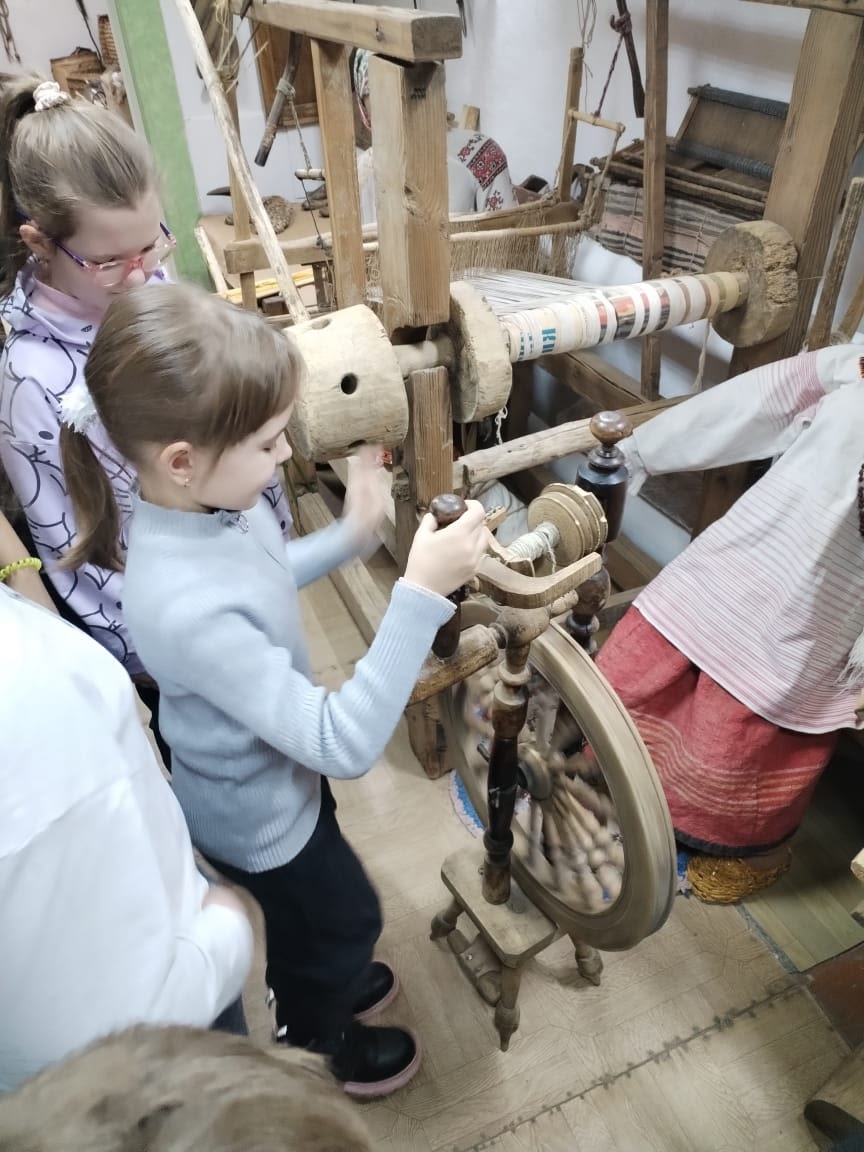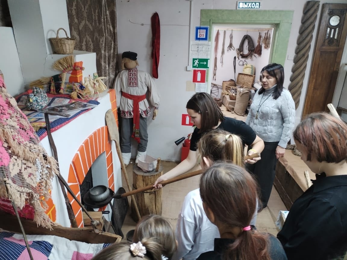 Ребята не просто слушали рассказы, но и вживую держали в руках предметы старинного обихода: тяжёлую чугунную кочергу, прялку с веретеном, котелок с «ушками», без которого не обходилась ни одна печь.