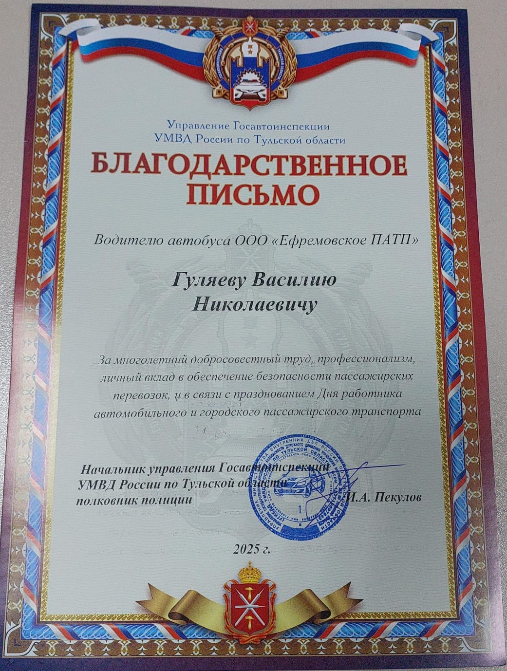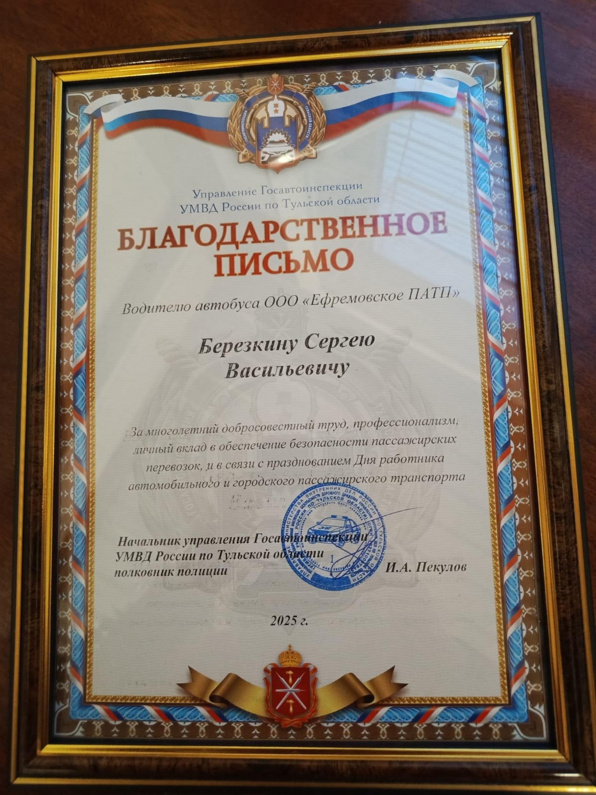 В Туле состоялось торжественное собрание, посвящённое Дню работника транспорта. На профессиональный праздник были приглашены водители из города Плавска — Сергей Васильевич Берёзкин и Василий Николаевич Гуляев. Им вручили региональные награды, а также выразили благодарность и поздравления за их добросовестный труд.