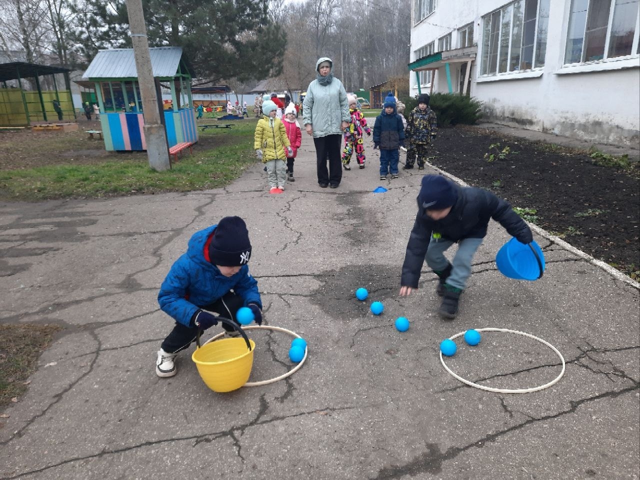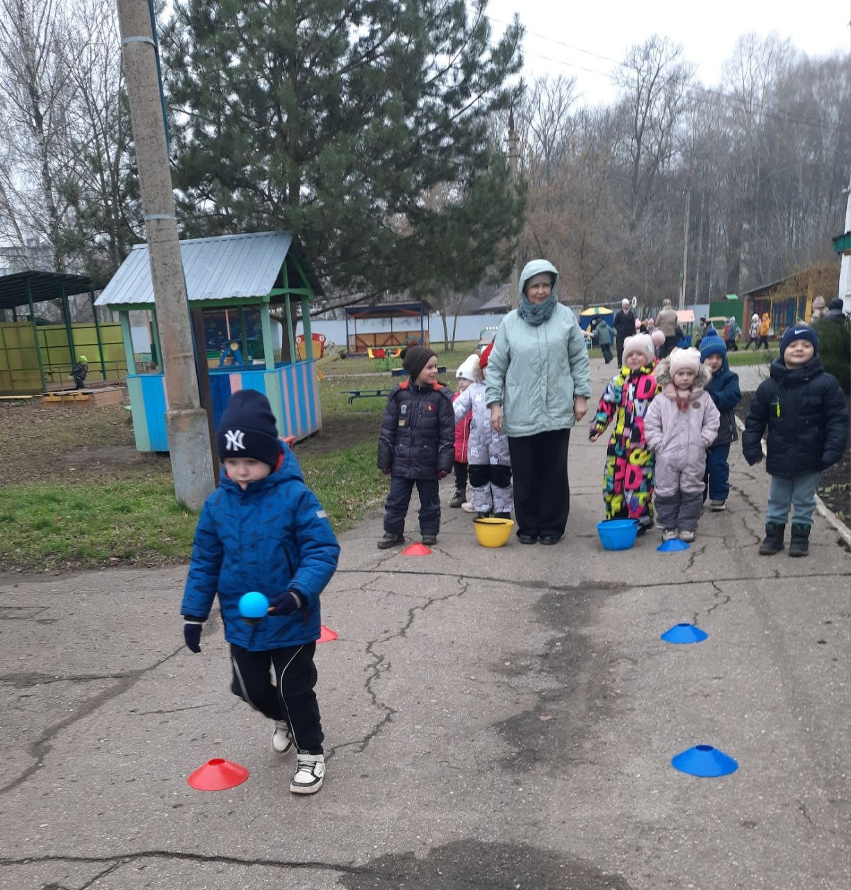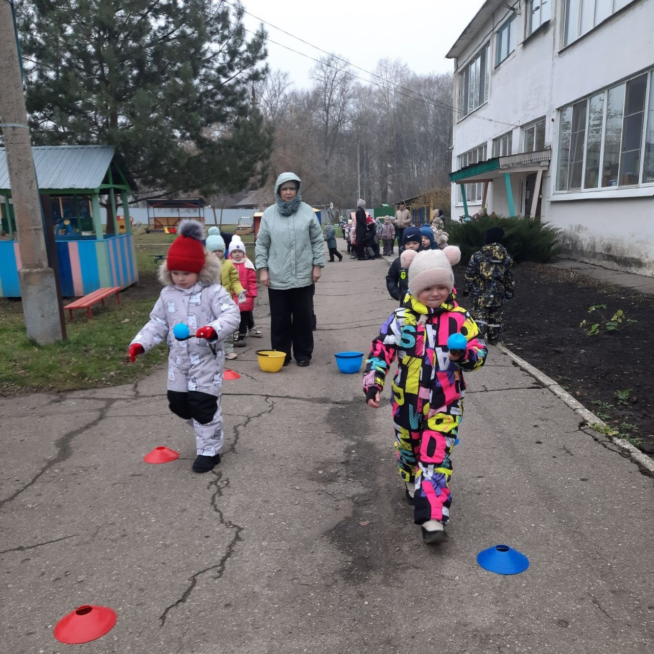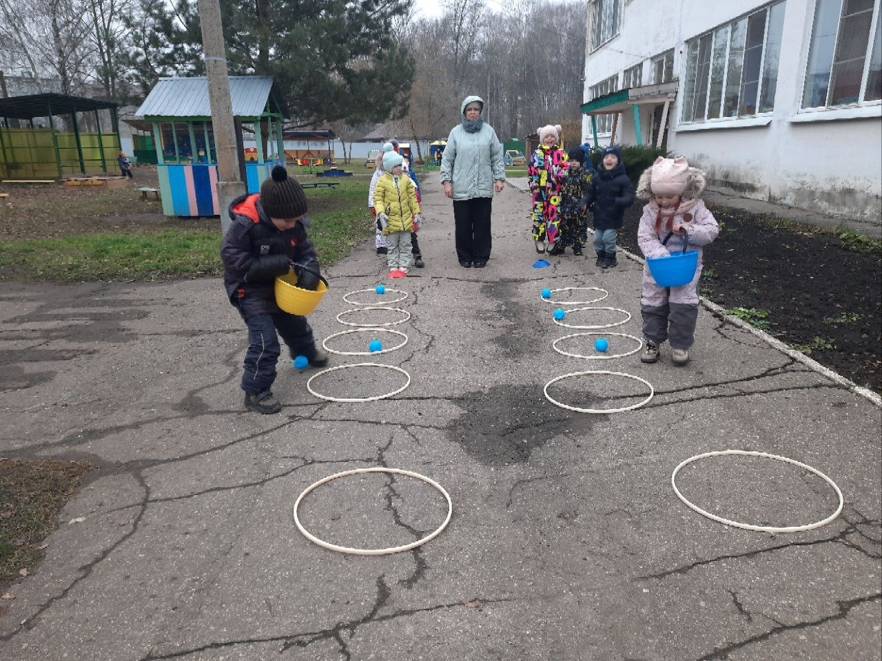 На занятии по физкультуре воспитанники детского сада комбинированного вида № 1 устроили весёлую игру в снежки – правда, «снежки» были не настоящие, для нее использовали пластиковые шарики.