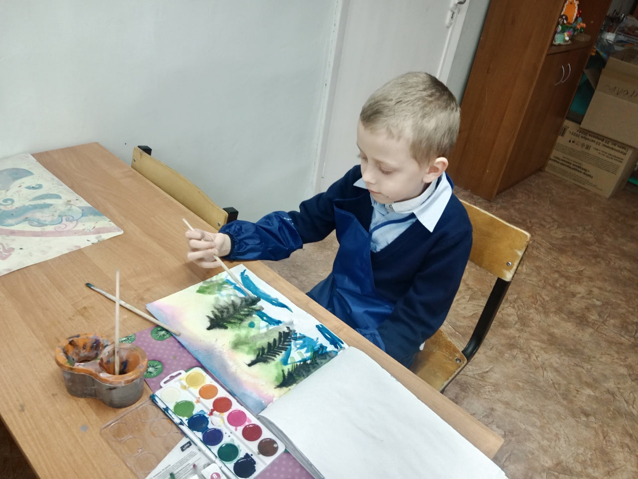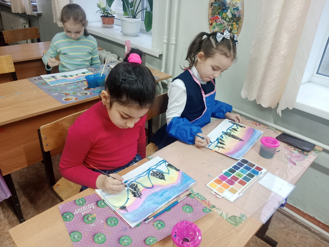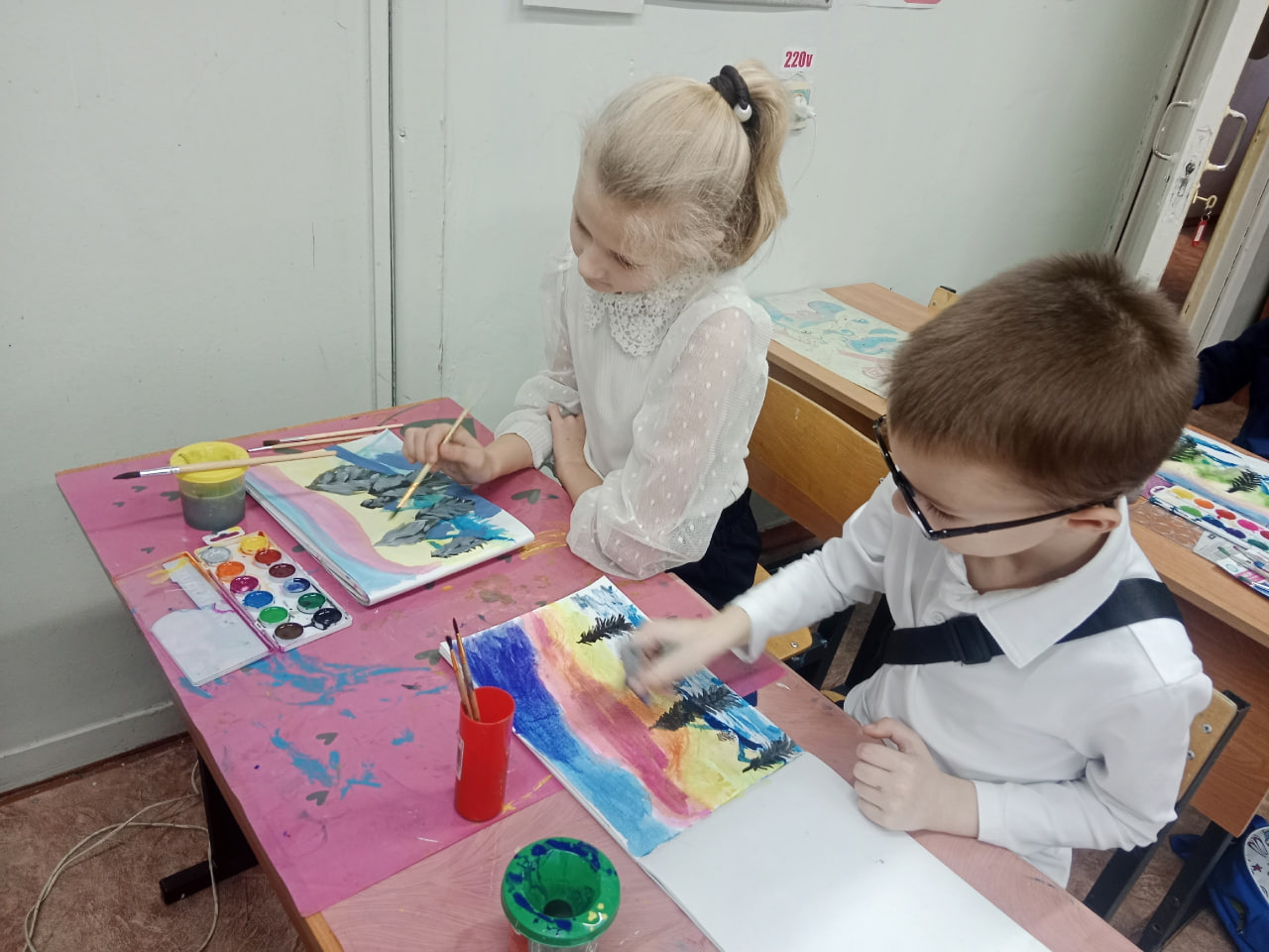 Затем юные художники принялись за работу. Они размывали яркие акварельные краски на влажной бумаге, создавая таинственные сполохи.