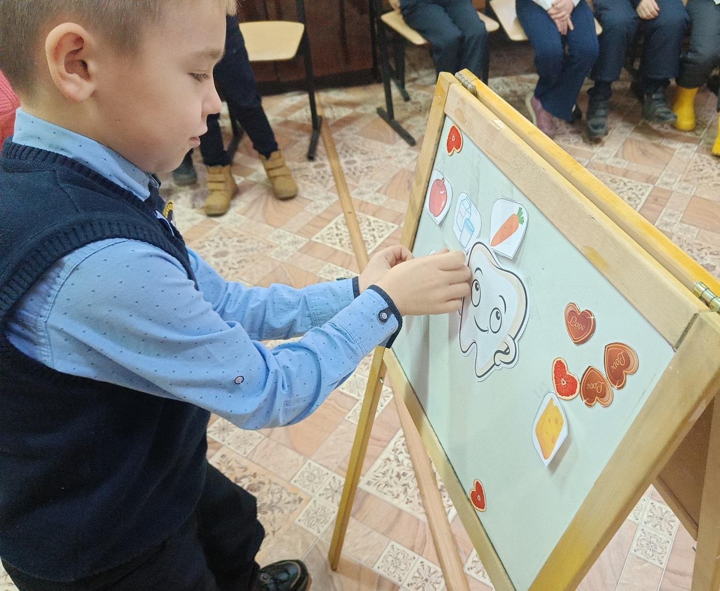 Ведущая напомнила ребятам основные правила гигиены полости рта. Ребята с большим интересом рассматривали макет зуба, увидели, как на поверхности эмали появляется кариес, и узнали, что делать, чтобы он не появлялся у тех, кто ведёт здоровый образ жизни.