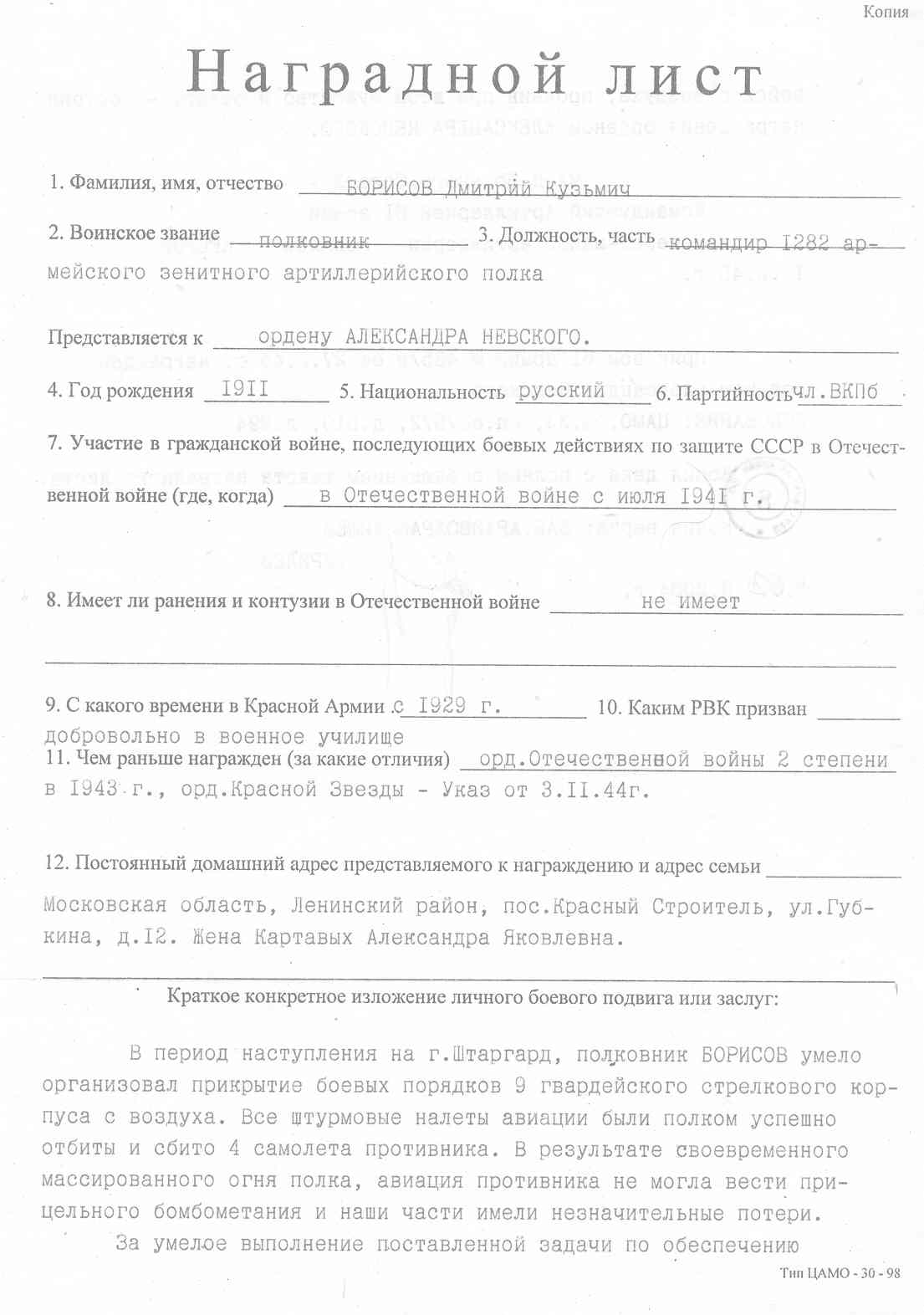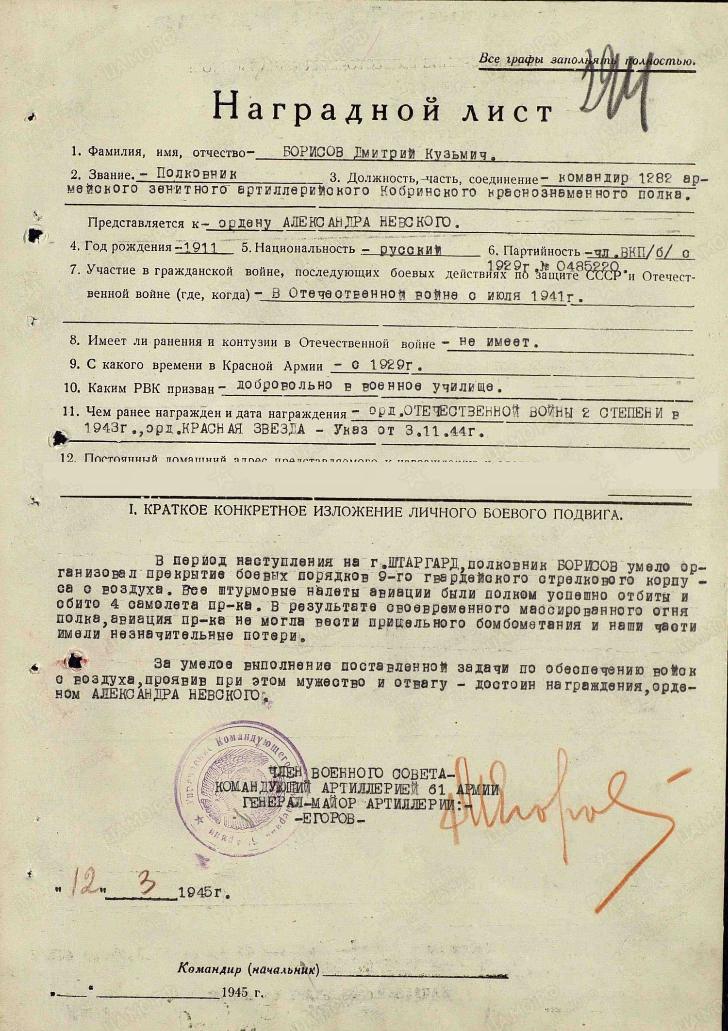 За годы войны полковник Борисов проявил себя как исключительно грамотный, храбрый и ответственный командир. Особенно отличился он в боях под городом Штаргард (ныне Польша) в марте 1945 года. Тогда он успешно прикрыл с воздуха боевые порядки 9-го гвардейского стрелкового корпуса, отбив все налёты вражеской авиации и сбив четыре самолёта. За этот подвиг он был удостоен ордена Александра Невского.