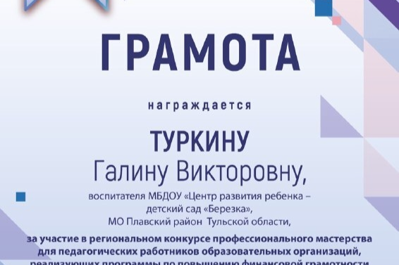 Воспитатель детского сада «Березка» Галина Туркина приняла участие в региональном конкурсе профессионального мастерства для педагогических работников образовательных организаций. Конкурс был посвящён актуальной теме – повышению финансовой грамотности и формированию финансовой культуры у обучающихся.