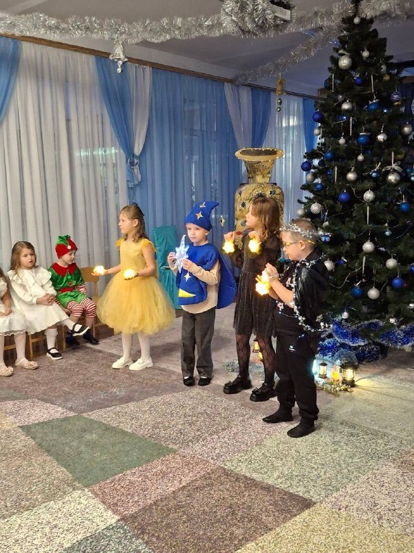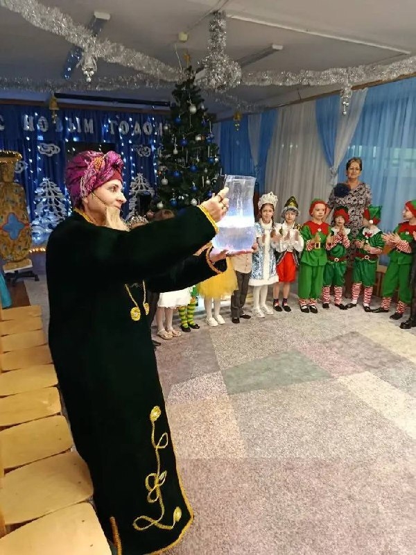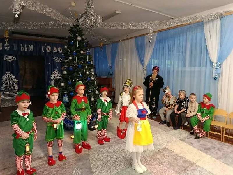 Маленькие воспитанники встретились со Стариком Хоттабычем, Северным Вихрем, Белоснежкой и ее верными гномами, а также величественной Королевой Ночи в сопровождении Месяца и звездочек. Не обошлось без Снегурочки и ее веселых снежинок.