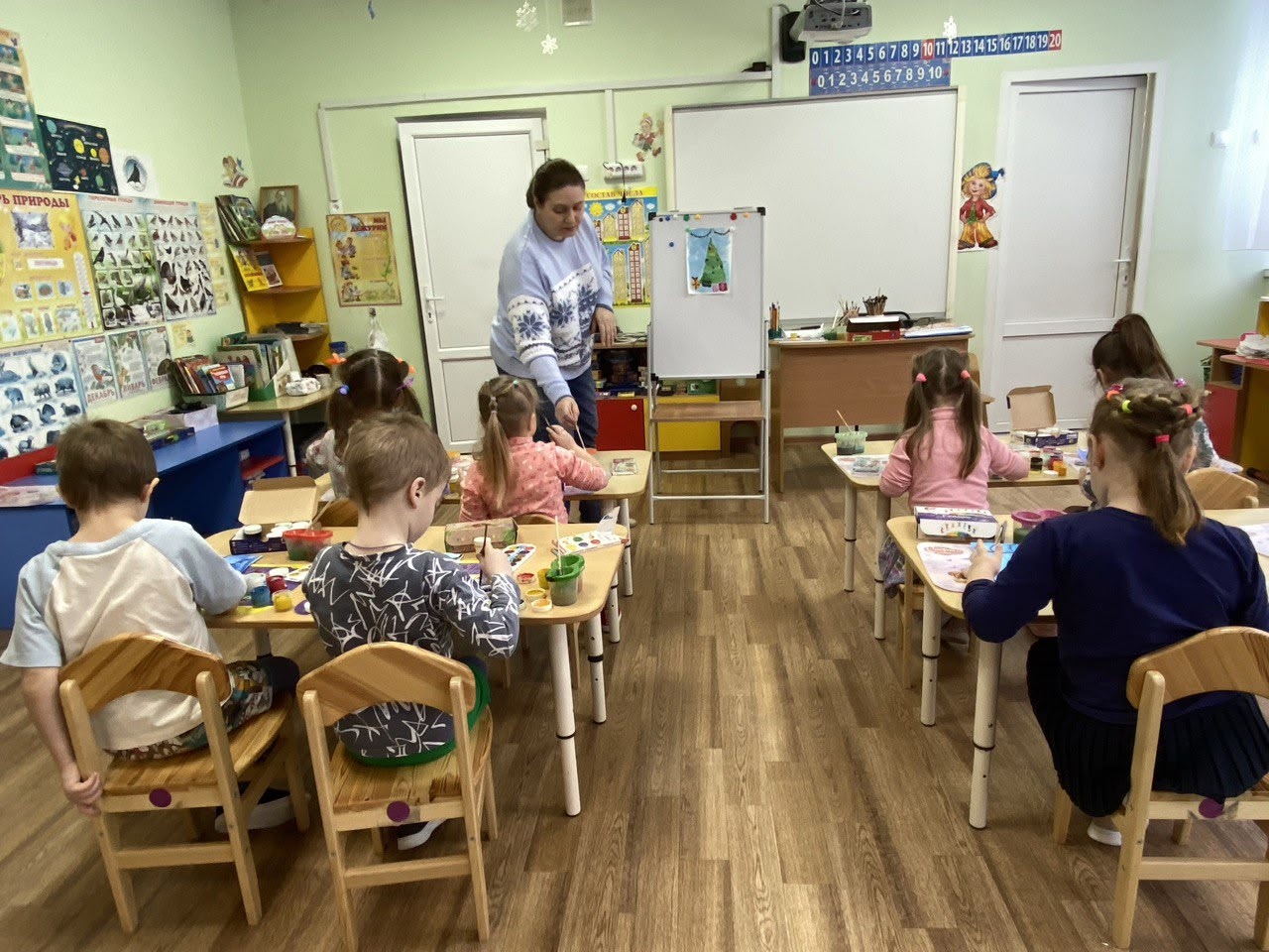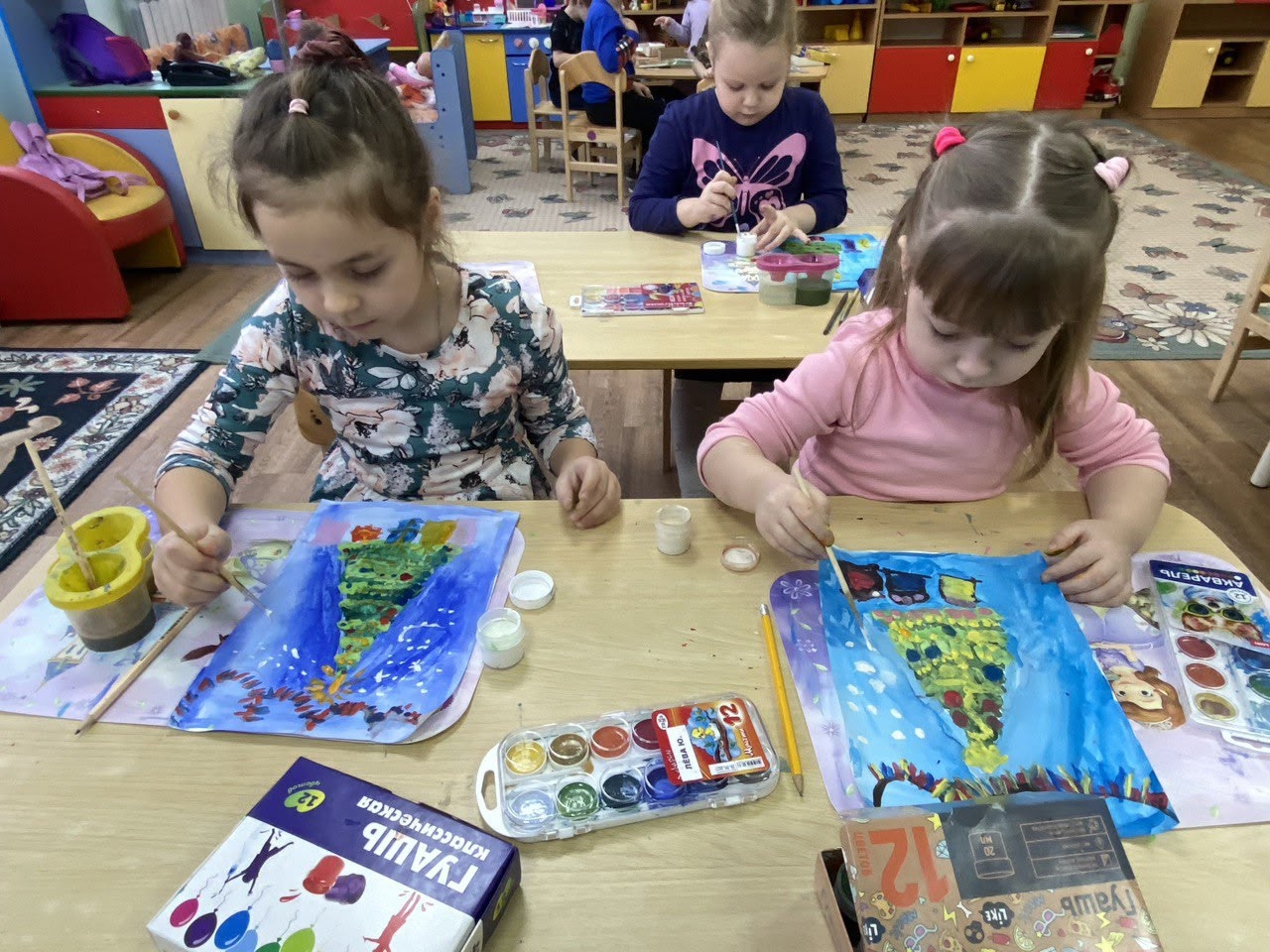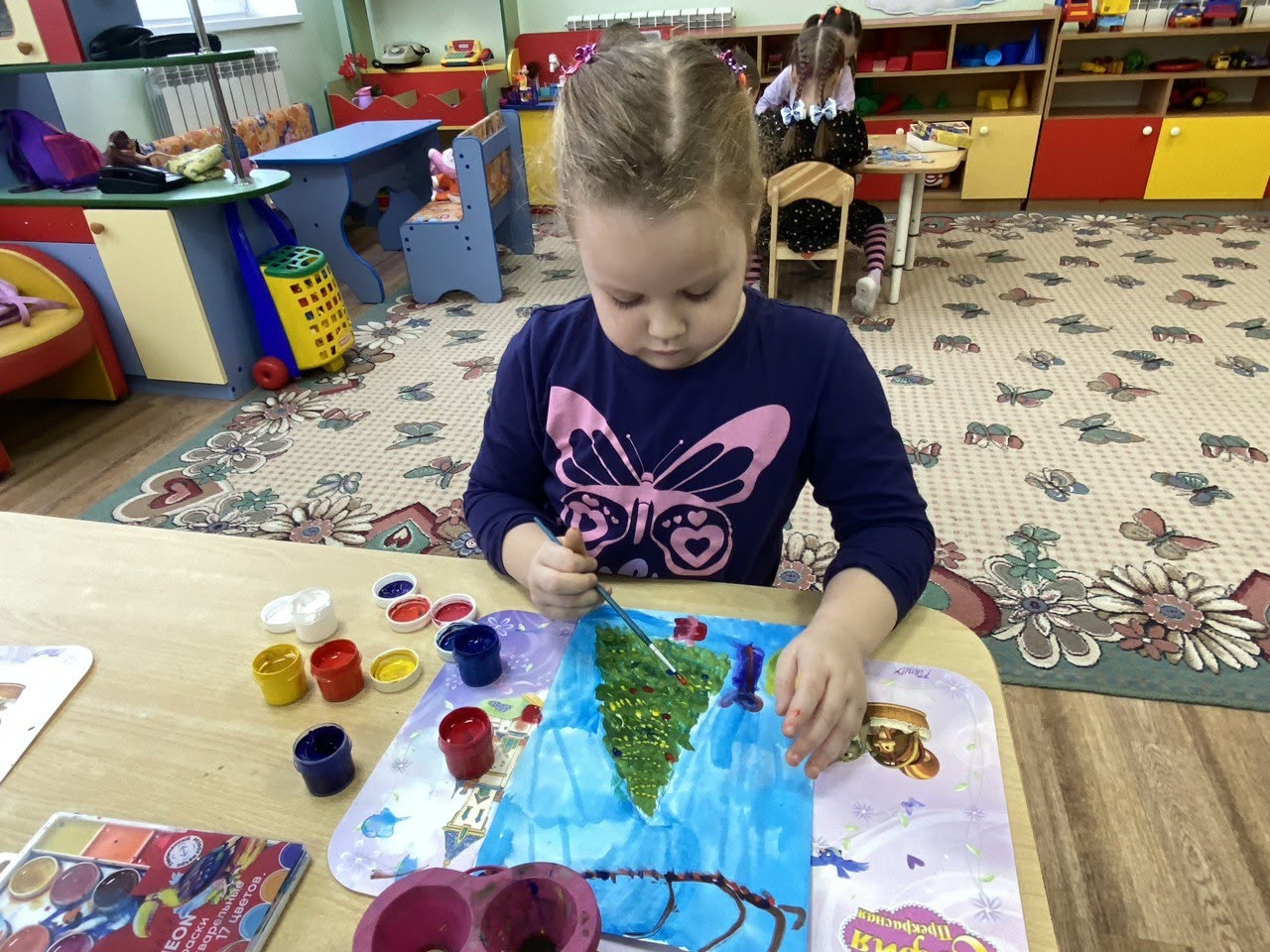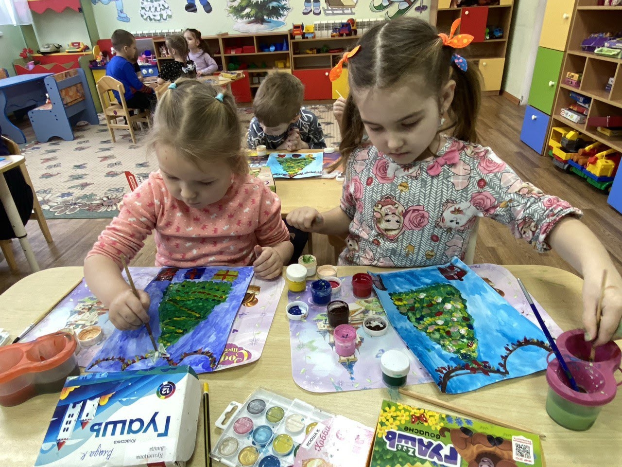 Воспитанники детского сада «Улыбка» поселка Горбачево на время вообразили себя живописцами и увлеченно работали над рисунком украшенной к празднику новогодней красавицы.