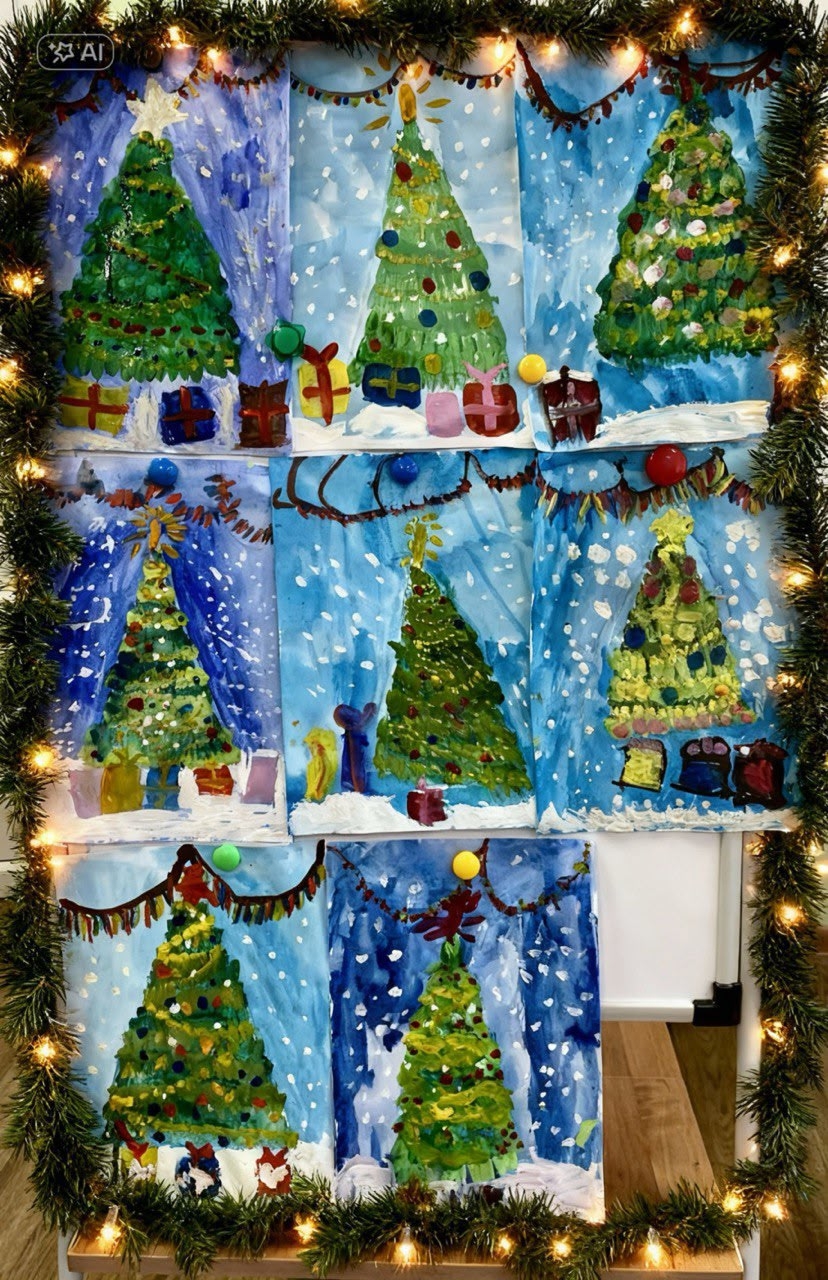 На творческом развивающем занятии юным сельчанам предложили нарисовать новогоднюю ель. Они охотно принялись за работу. Стройными, пышными, ярко-зелеными получились у детей праздничные деревья.