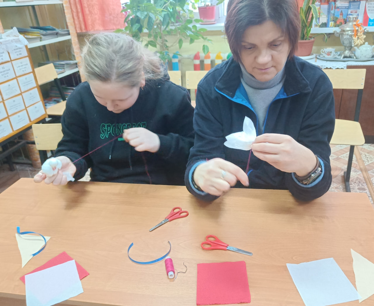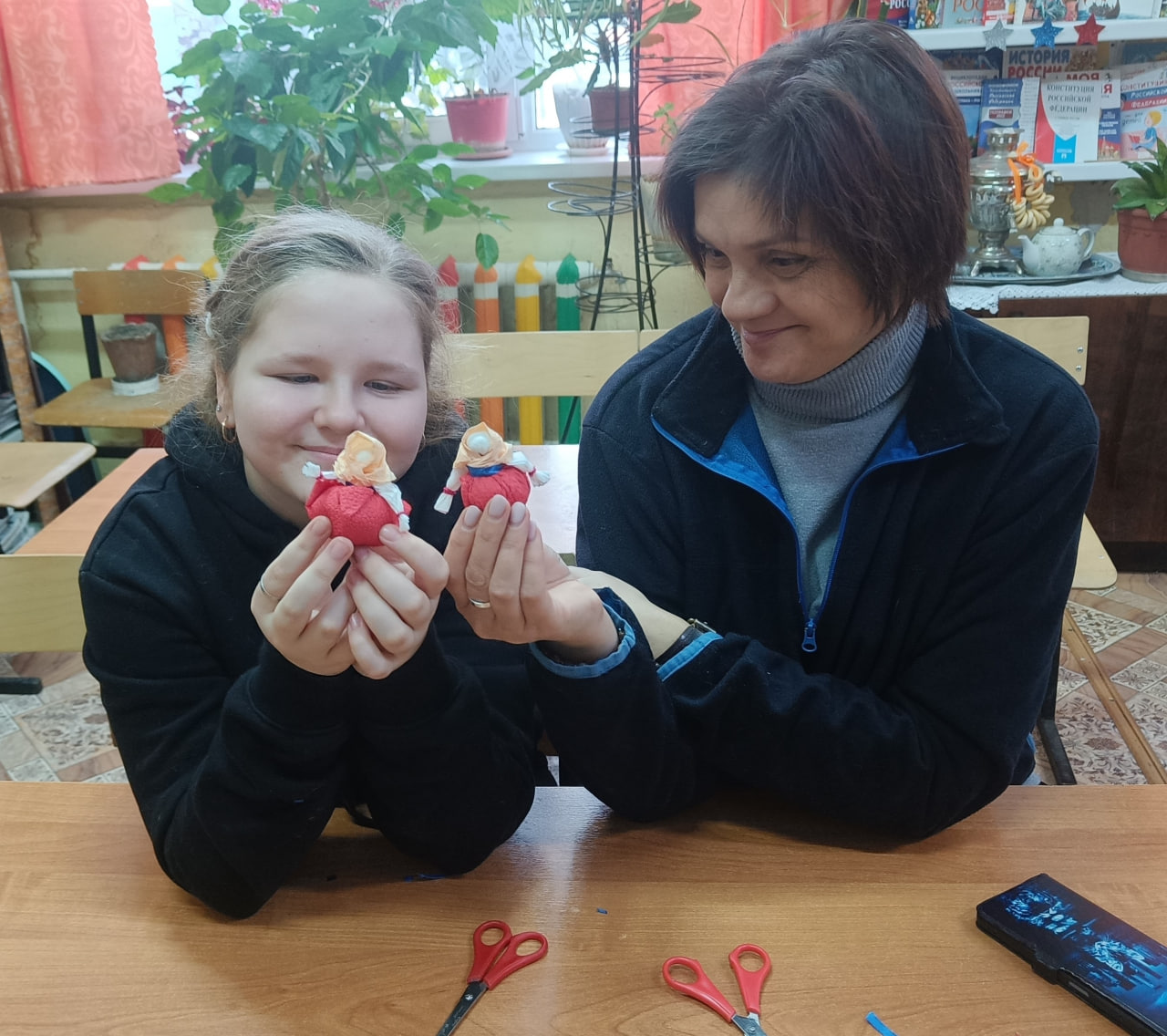 Затем началась самая увлекательная часть – мастер-класс по изготовлению народной обережной куклы «Денежная кукла Дуняша». Всего лишь несколько цветных салфеток, нитки, пятирублёвая монетка и хорошее настроение — и в руках у каждого участника появилась собственная кукла-оберег.