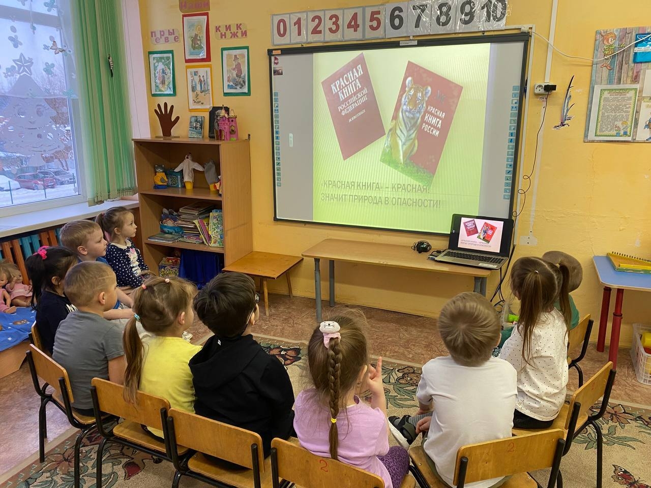 Дети посмотрели иллюстрированную презентацию, в которой рассказывалось о редких обитателях лесов, полей и водоёмов – тех, кого можно встретить на страницах Красной Книги.