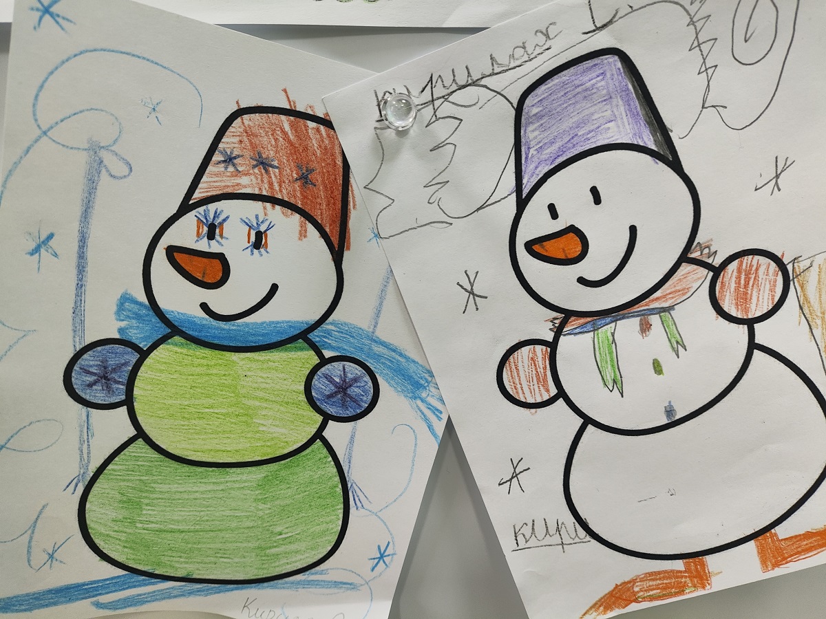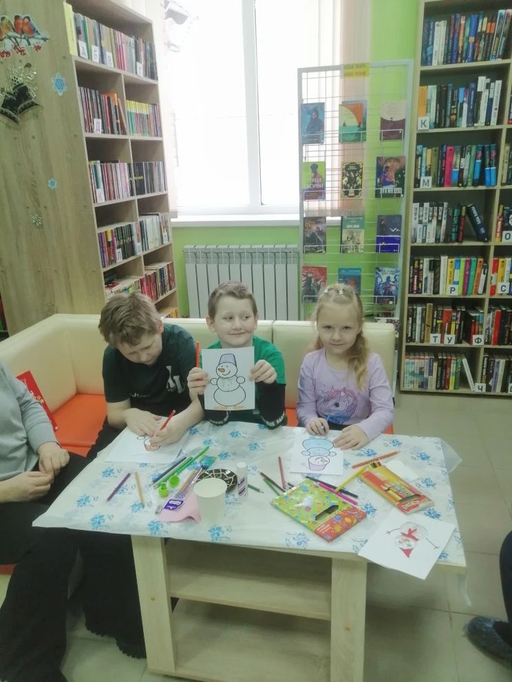 Юные художники увлечённо работали над изображением веселых снеговичков, используя карандаши и гуашь. Библиотекари помогали им, подсказывали идеи и поддерживали творческий процесс.