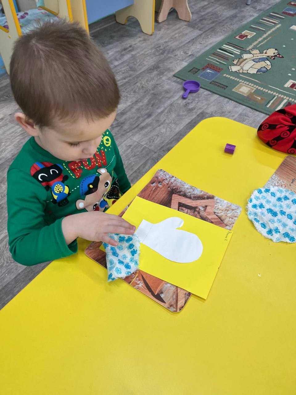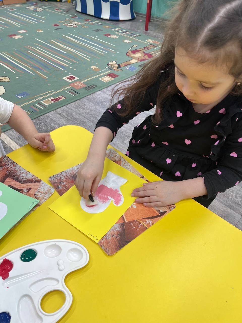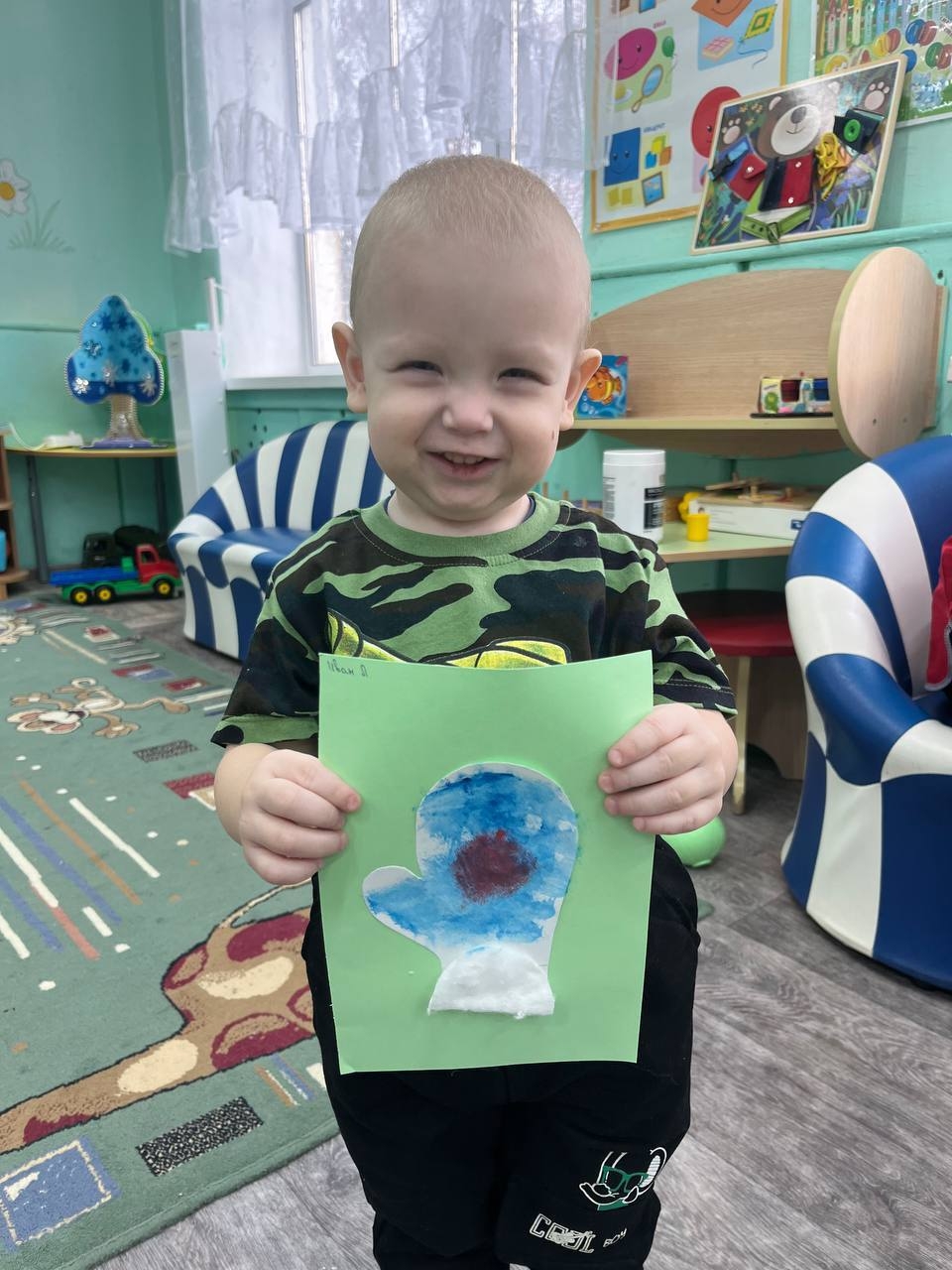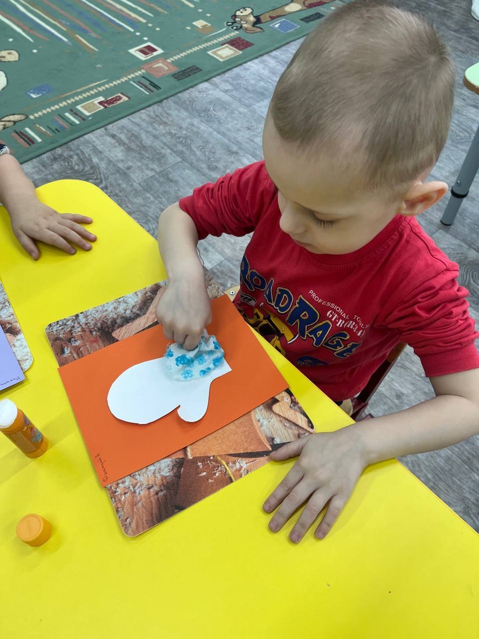 Воспитатель провела с детьми занятие на тему «Варежка». Ребят снабдили изготовленными к мероприятию шаблонами. А дети на них выполняли узоры с помощью поролона и гуаши.
