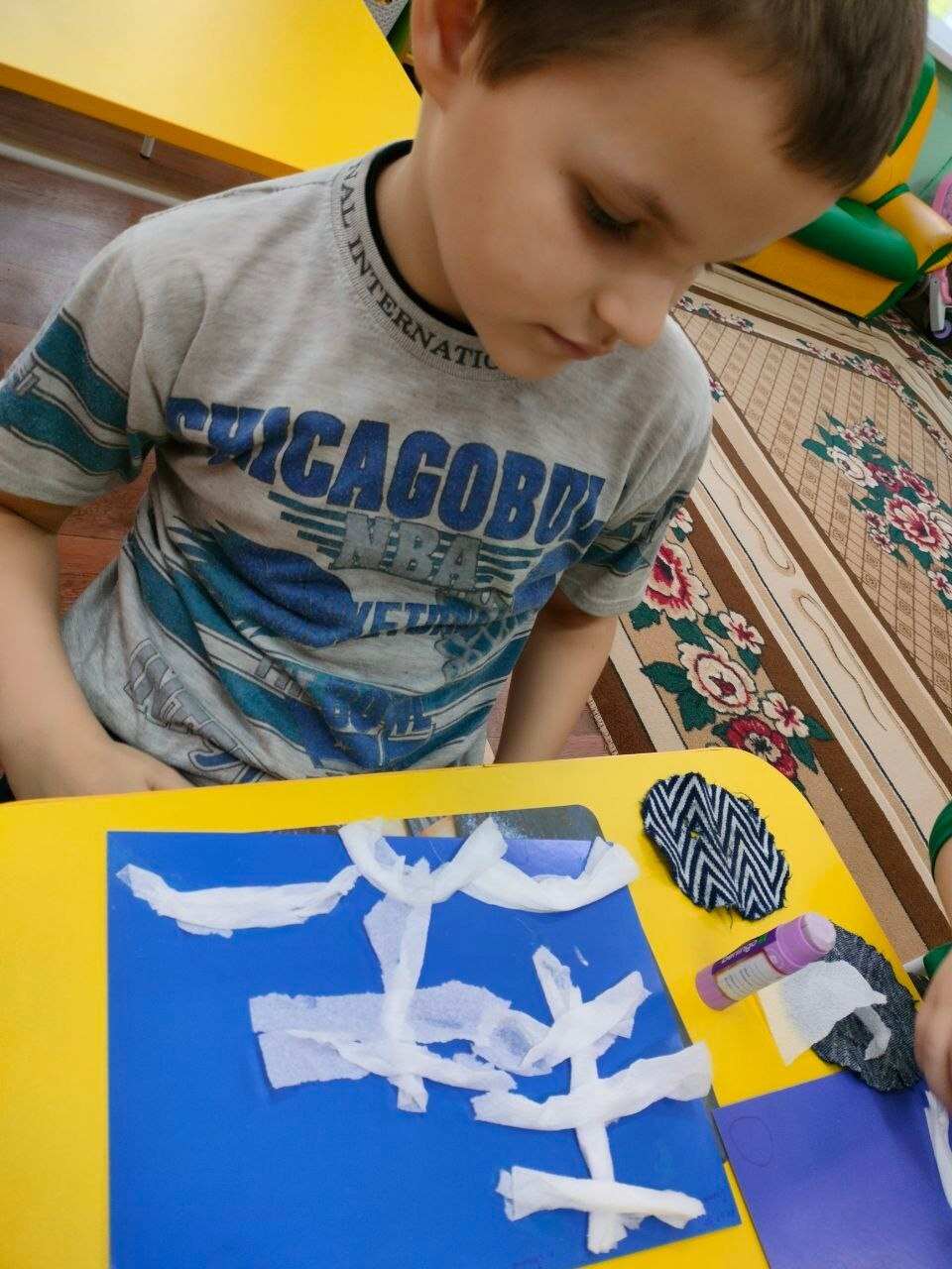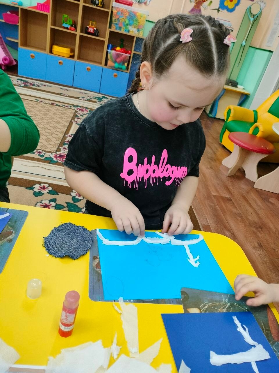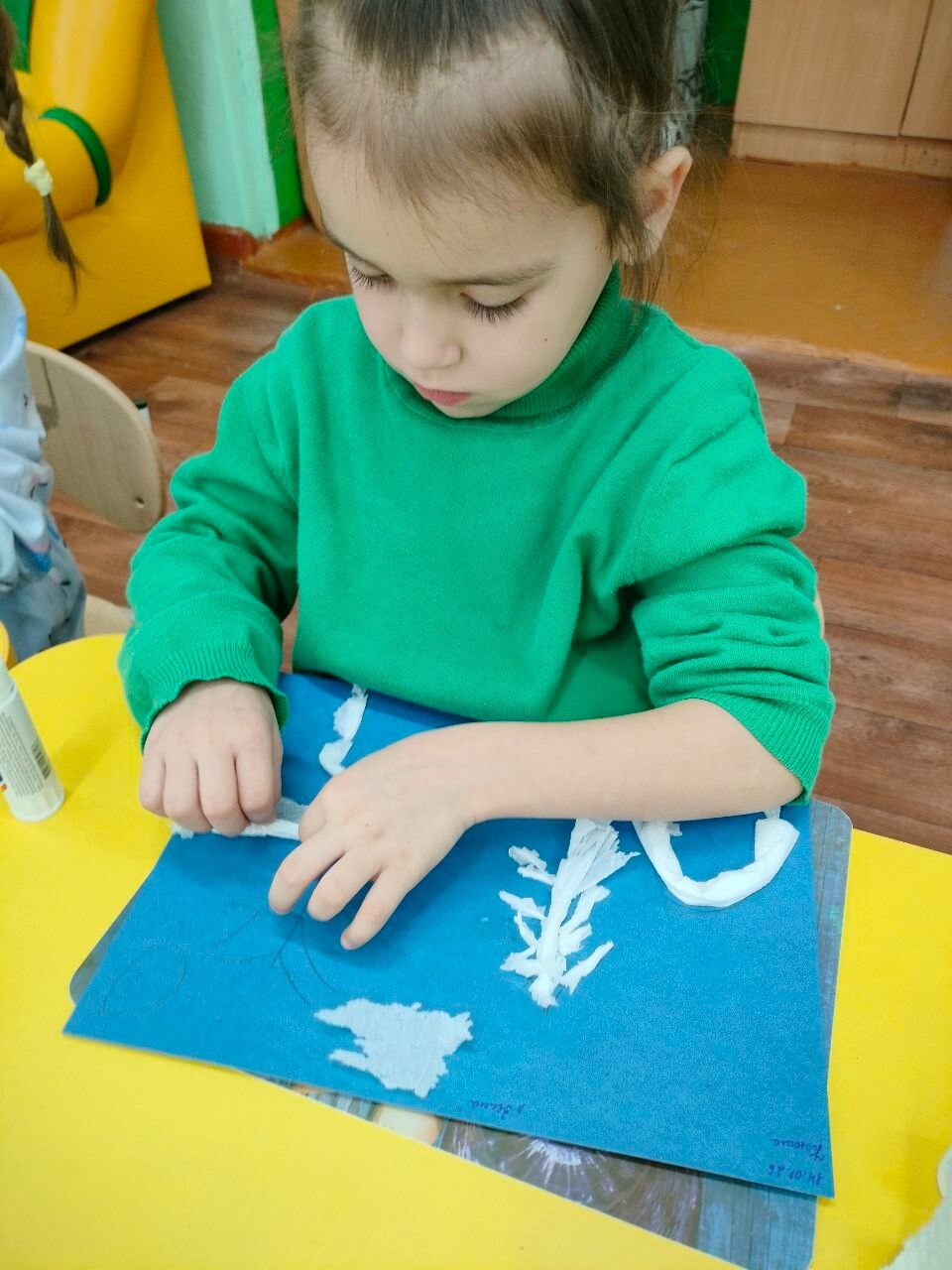 На занятии по художественно-эстетическому развитию «Аппликация «Зима», организованном педагогами детского сада, дети под руководством воспитателя выполнили свои работы с помощью салфеток и нетрадиционного способа – обрывной техники. Дети с большим удовольствием нарисовали эскиз зимы на картоне и дополнили его кусочками белых салфеток, имитируя снег. В конце занятия ребята рассказали о своих зимних забавах на каникулах.