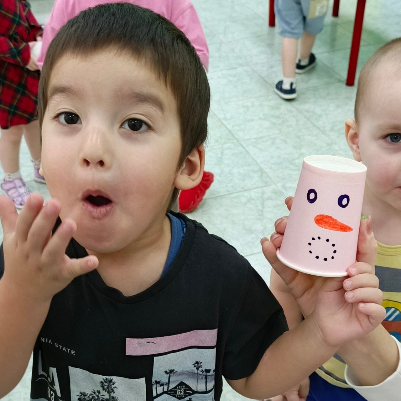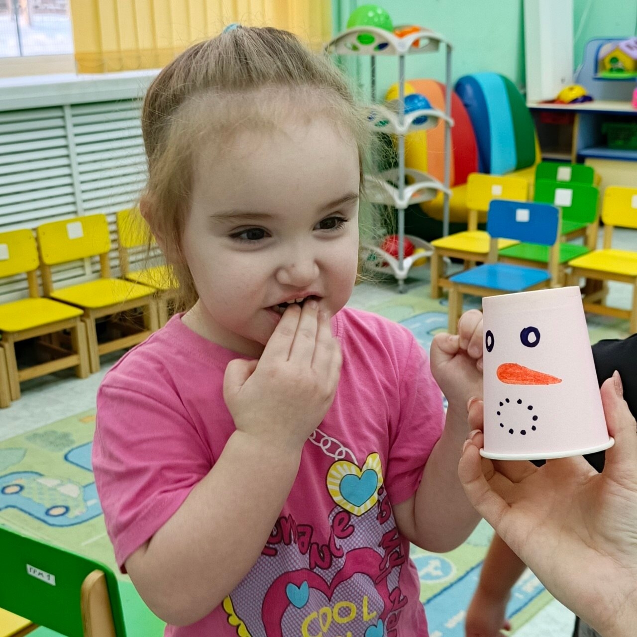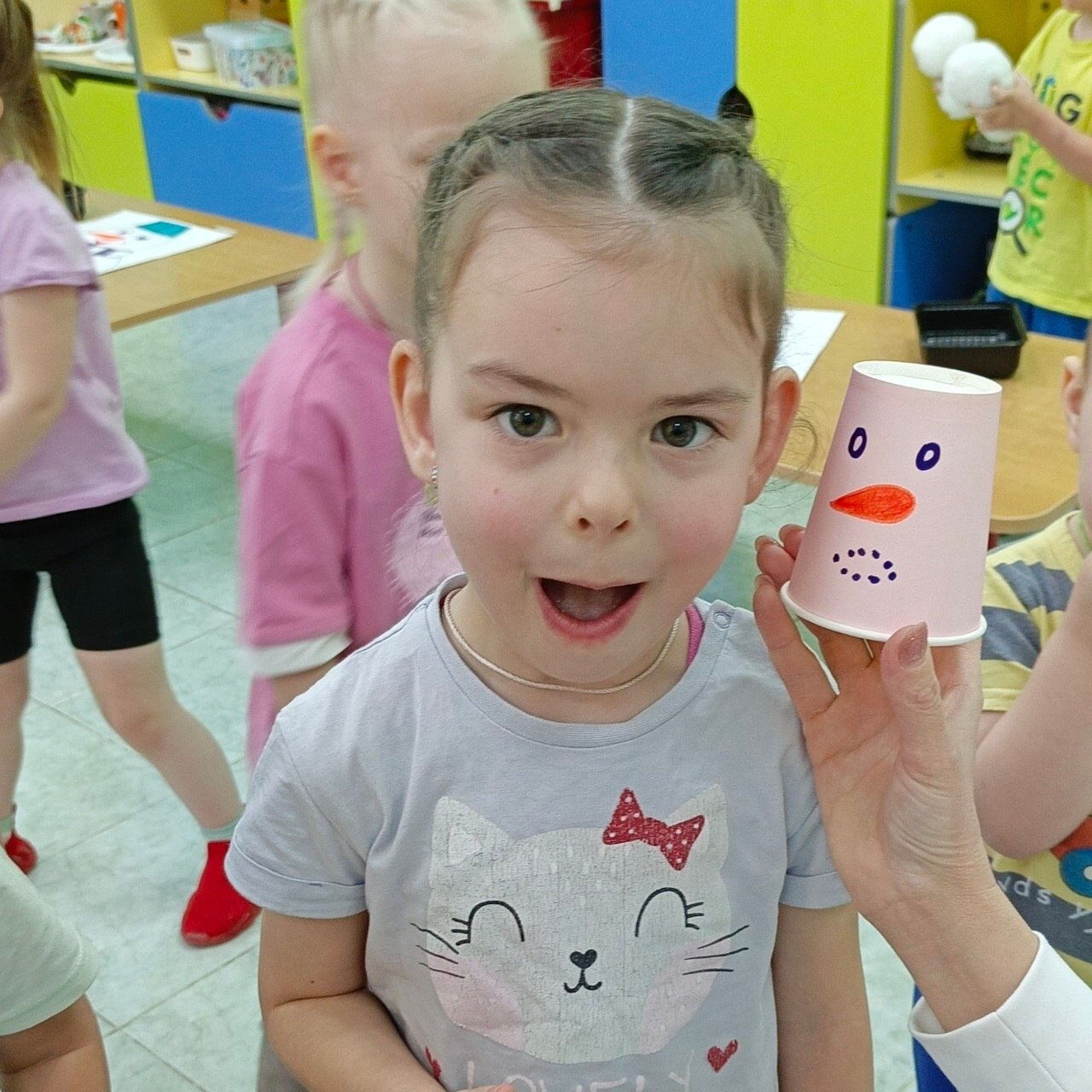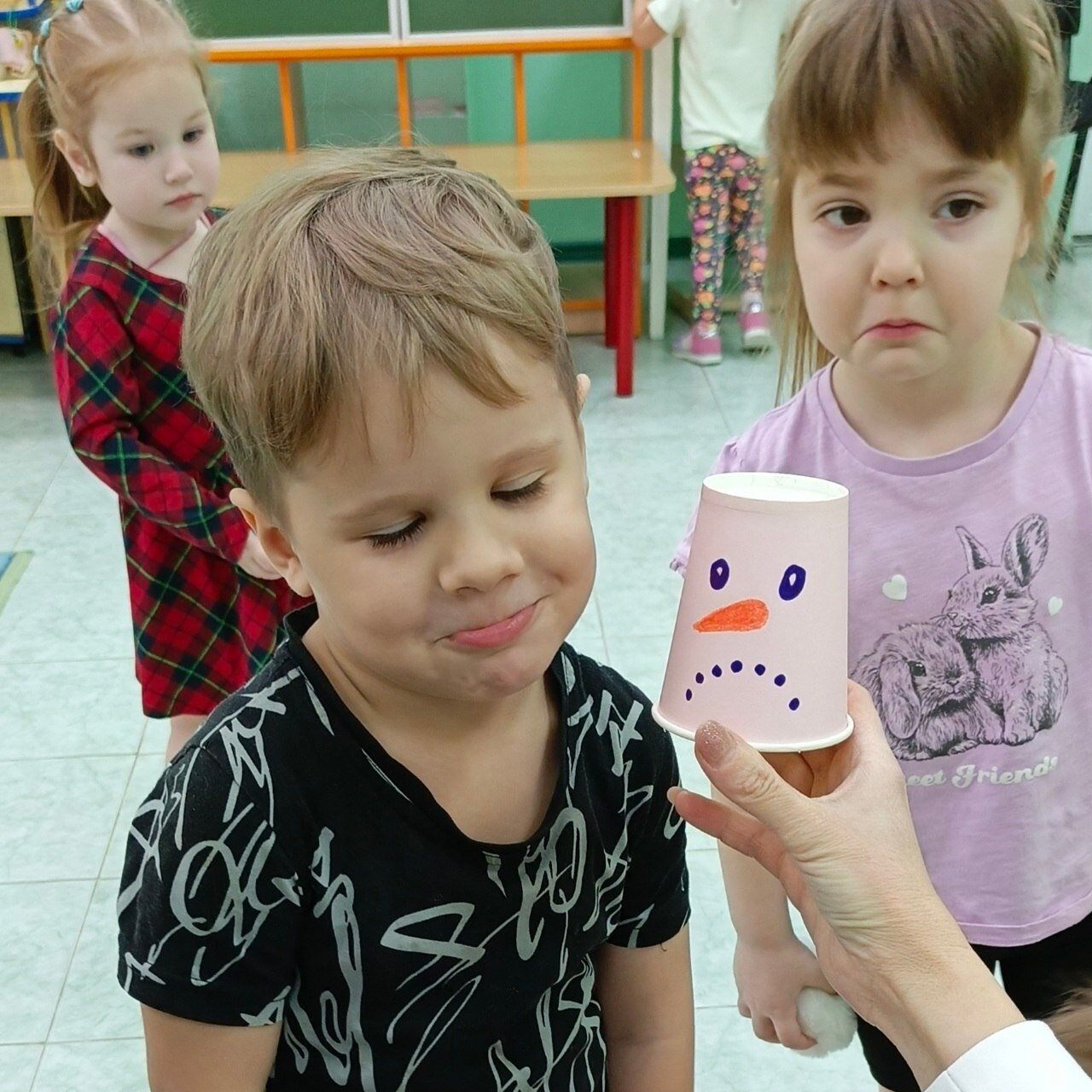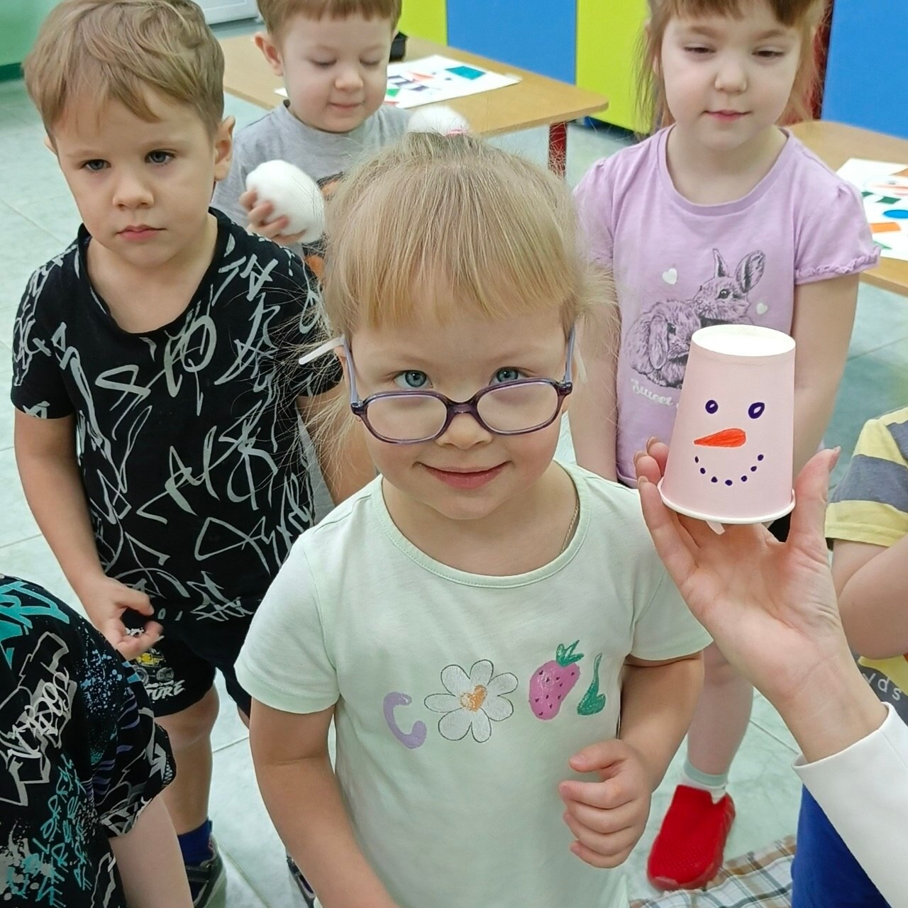 Под названием «Повтори за снеговиком!» прошёл игровой урок, посвящённый эмоциям и настроению. Воспитатели подготовили яркие бумажные стаканчики, на которых нарисовали весёлых снеговиков с разными выражениями лиц: радостных, удивлённых, задумчивых, грустных и даже немного хитрых!