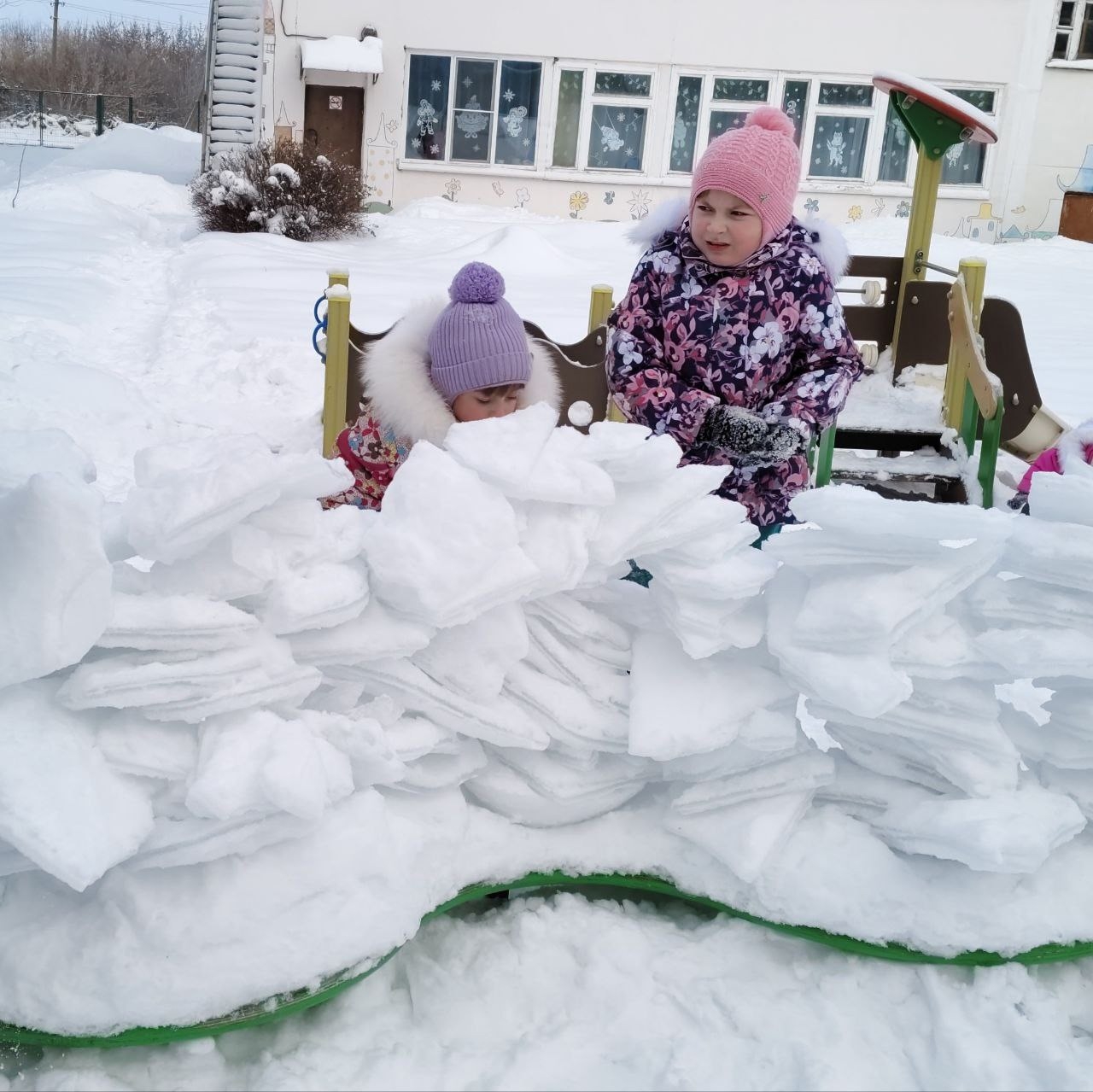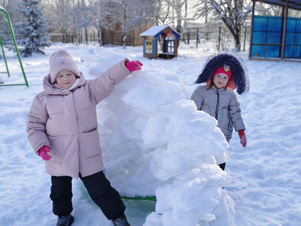 После этого настало время для творчества: дети начали строить снежную крепость.