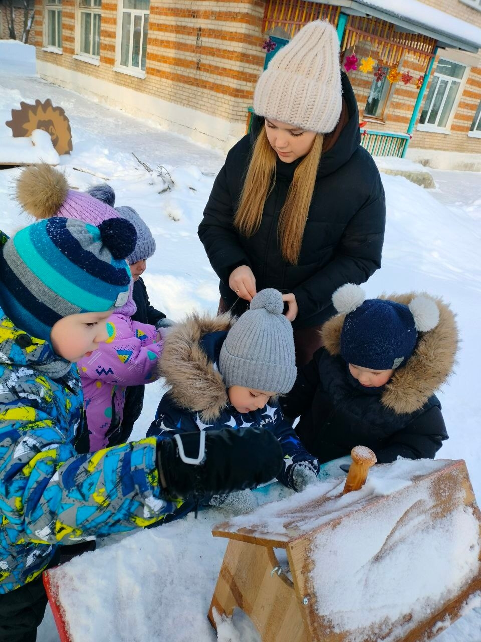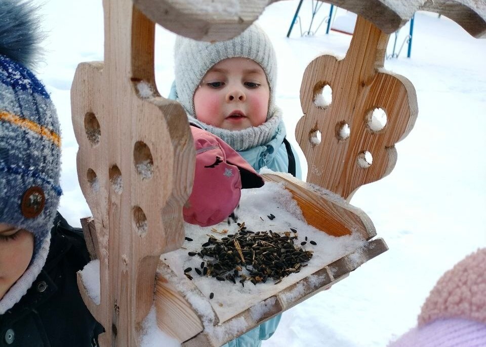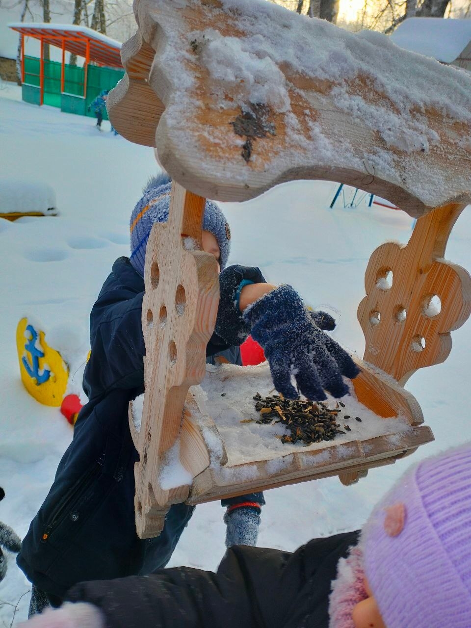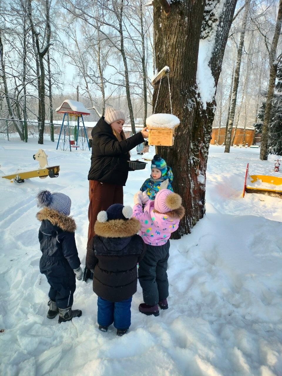 Время прогулки для детей младшей и старшей групп детского сада в поселке Молочные Дворы было наполнено не только любованием искрящимся снегом, но и заботой о пернатом «населении», обитающем в поселке.