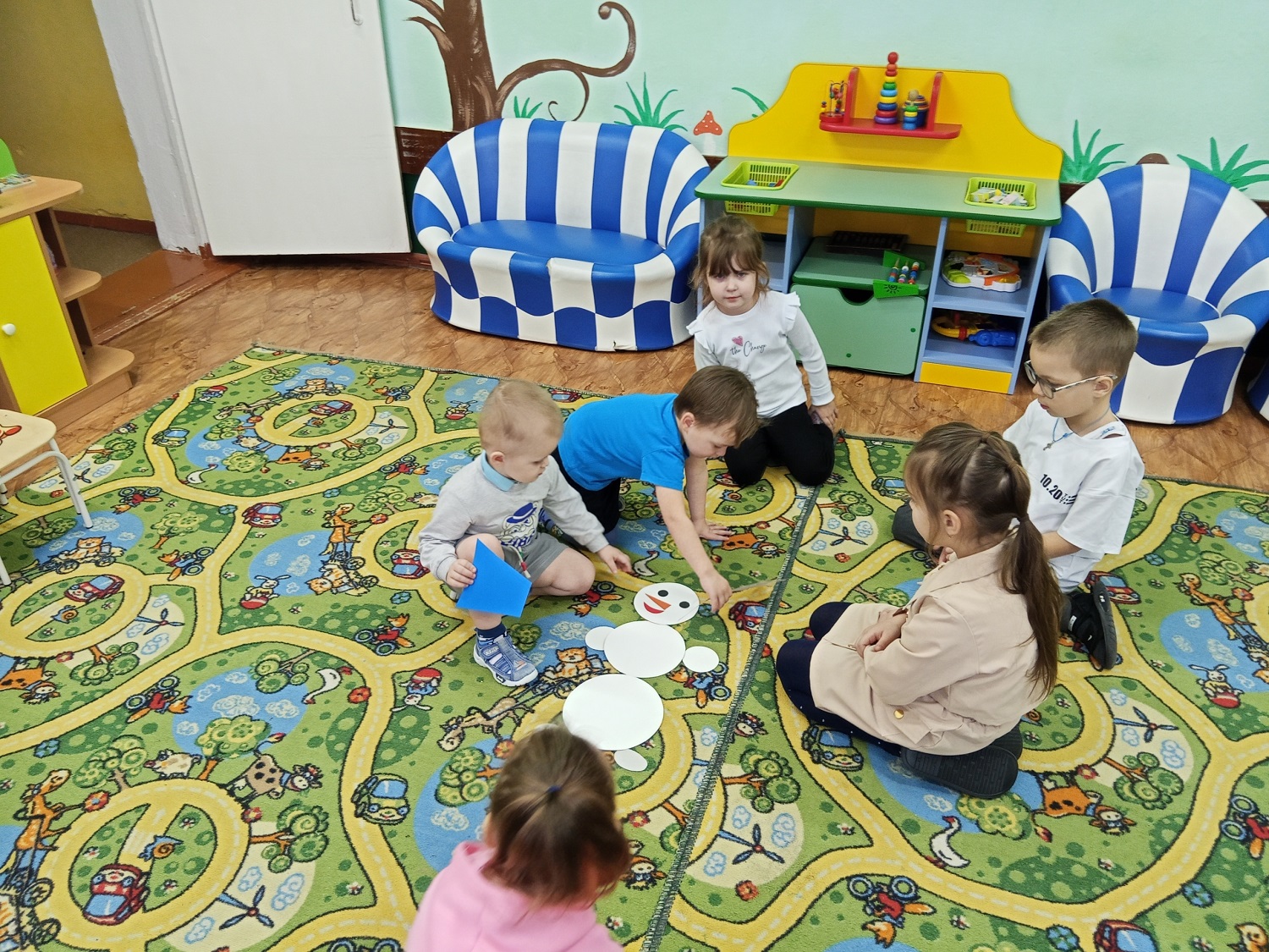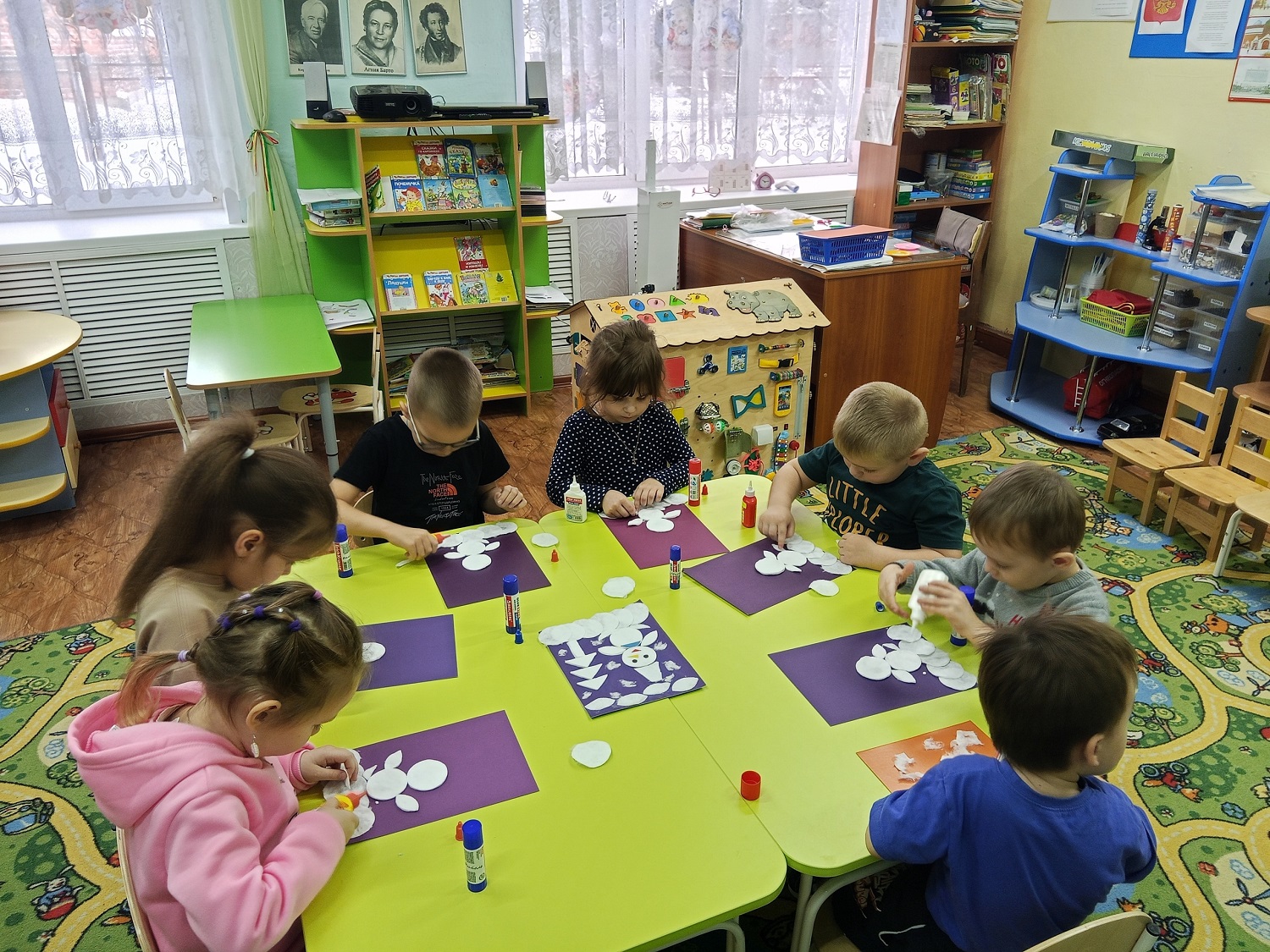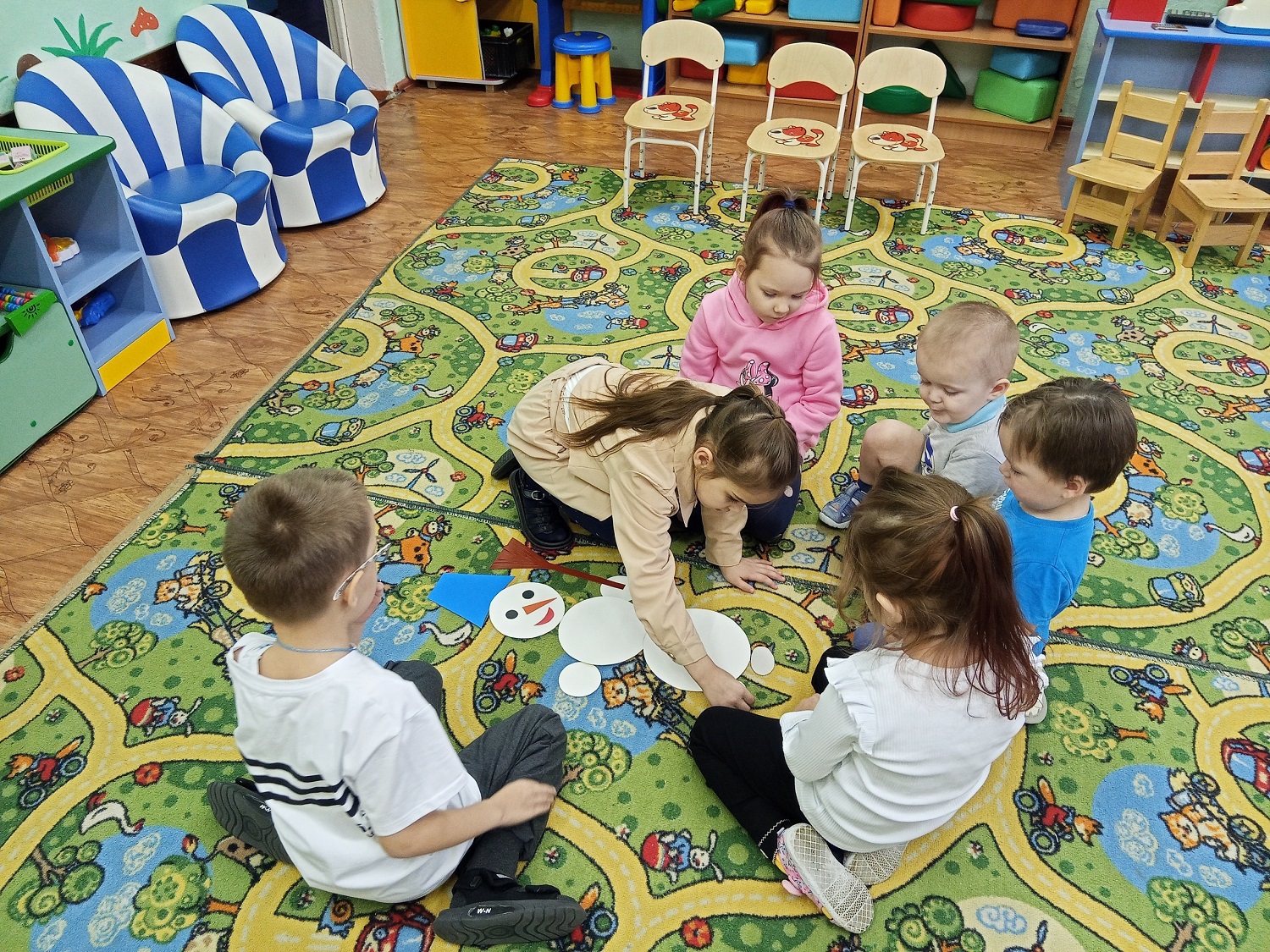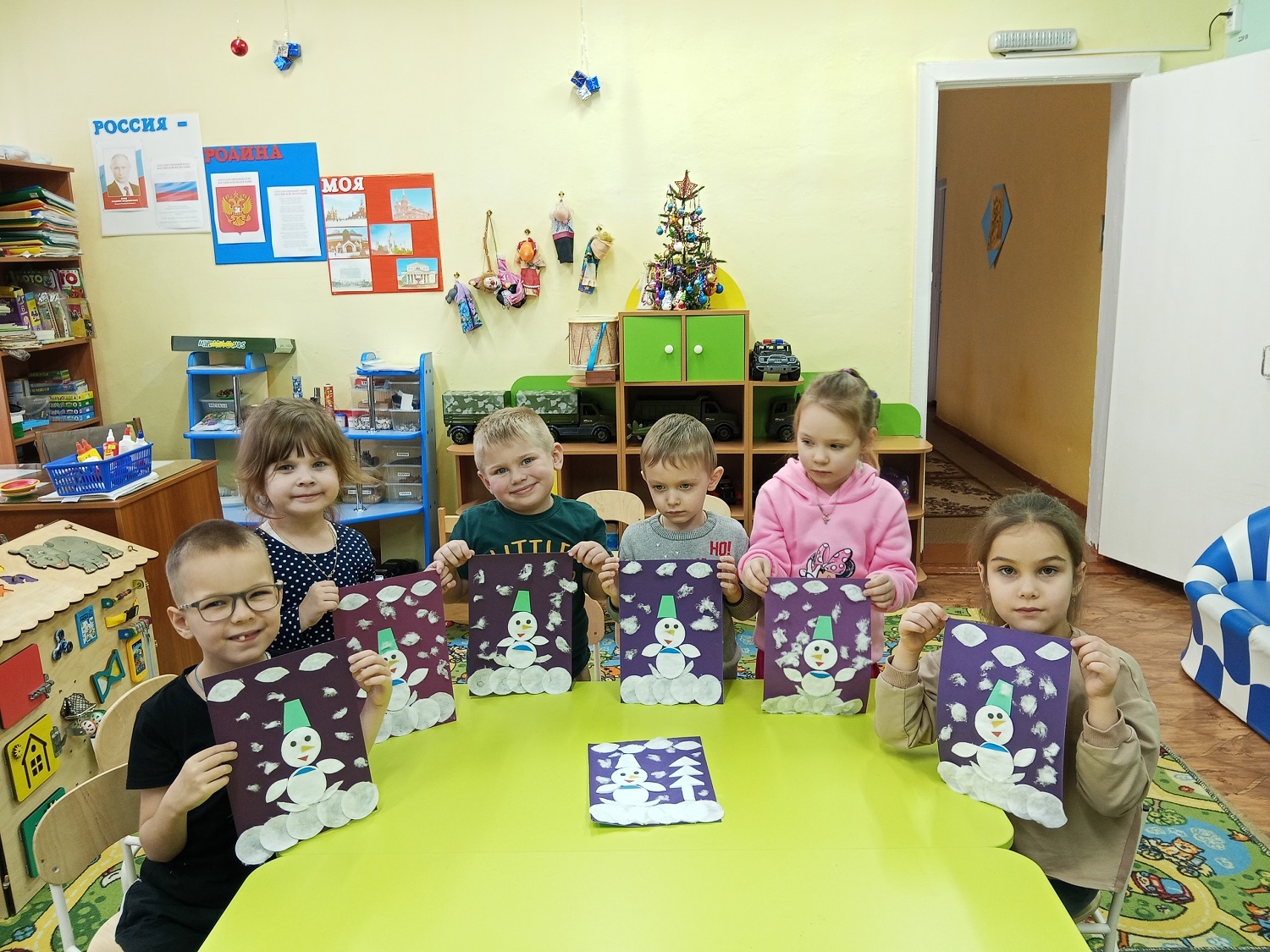 Снежный сказочный человечек с морковным носом, очень добрый, весёлый и забавный, стал героем работ воспитанников. Они выполняли рисунки снеговика, делали аппликации из ватных дисков.